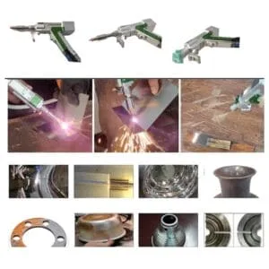 3 в 1 Зварювання, чищення, різання. 1,5 кВт Ручний зварювальний апарат з оптоволоконними лазерними випромінювачами. Використовується для зварювання нержавіючої сталі, титанового сплаву, алюмінію та інших металів. Характеризуються великою глибиною зварювання, міцністю зварних швів, підходять для зварювання будь-якої складності. Технологія включає точкове і шовне зварні з’єднання. Для шовного застосовується безперервний режим генерації або з перекриттям імпульсний, для точкового – тільки імпульсний.