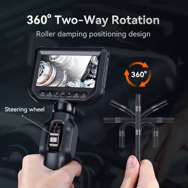 Ендоскоп S43 оснащений поворотною камерою на 360°, розташованою на гнучкому та міцному кабелі довжиною 1 м. Камерою можна керувати в обидва боки за допомогою ролика, розміщеного на ручці пристрою.