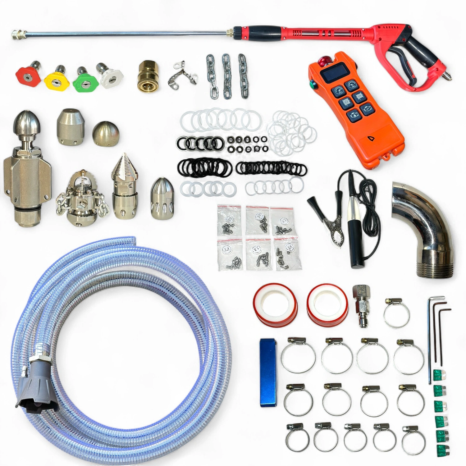 Комплектація включає прочисну машину, 11 насадок для прочистки каналізації, розхідні матеріали до насадок, пістолет високого тиску, чотири форсунки для пістолета з різною шириною розпилення, пульт дистанційного керування, лійку, ремінець на зап’ястя, ущільнювальні кільця, інструкцію та гарантію.