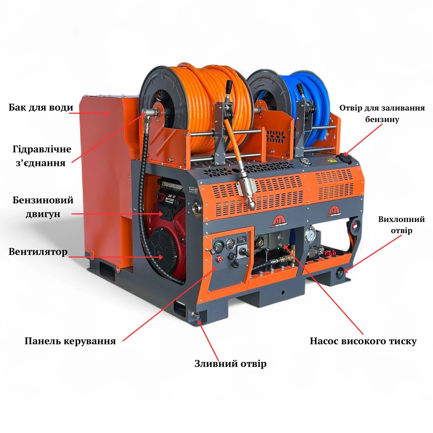 Прочисна гідродинамічна каналопромивна машина з бензиновим двигуном, призначена для прочищення та промивання трубопроводів діаметром від 50мм до 800мм.