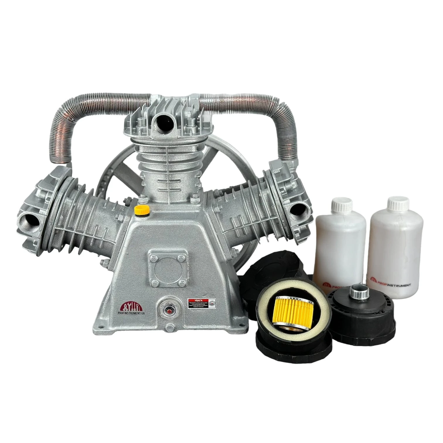 Поршневий компресорний блок 3090С Profinstrument є важливою складовою повітряної системи з ременним приводом, співпрацюючи з електричним мотором потужністю 5,5 кВт або 7,5 кВт. Він виконаний у формі поршневої головки, що є ключовим вузлом повітряного компресора.
