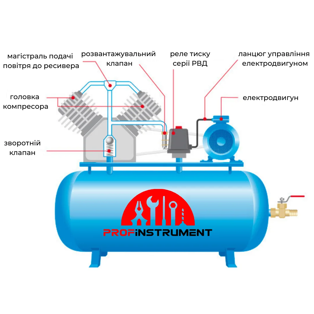Поршневий компресорний блок 3090С Profinstrument є важливою складовою повітряної системи з ременним приводом, співпрацюючи з електричним мотором потужністю 5,5 кВт або 7,5 кВт. Він виконаний у формі поршневої головки, що є ключовим вузлом повітряного компресора.