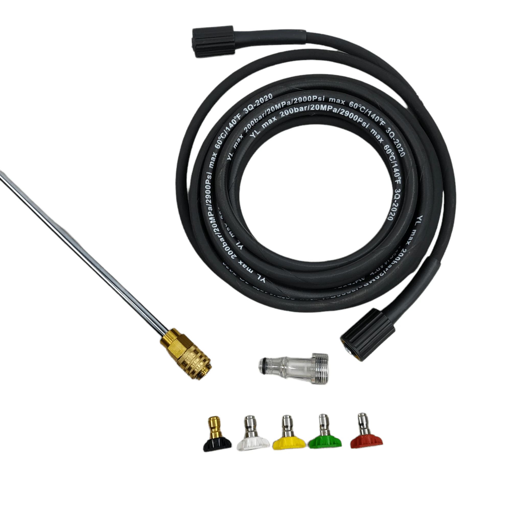 - пістолет + насадка з 5-ма форсунками (червона – кут розпилу 0°, жовта – кут розпилу 15°, зелена – кут розпилу 25°, біла – кут розпилу 40°, чорна – для піни);