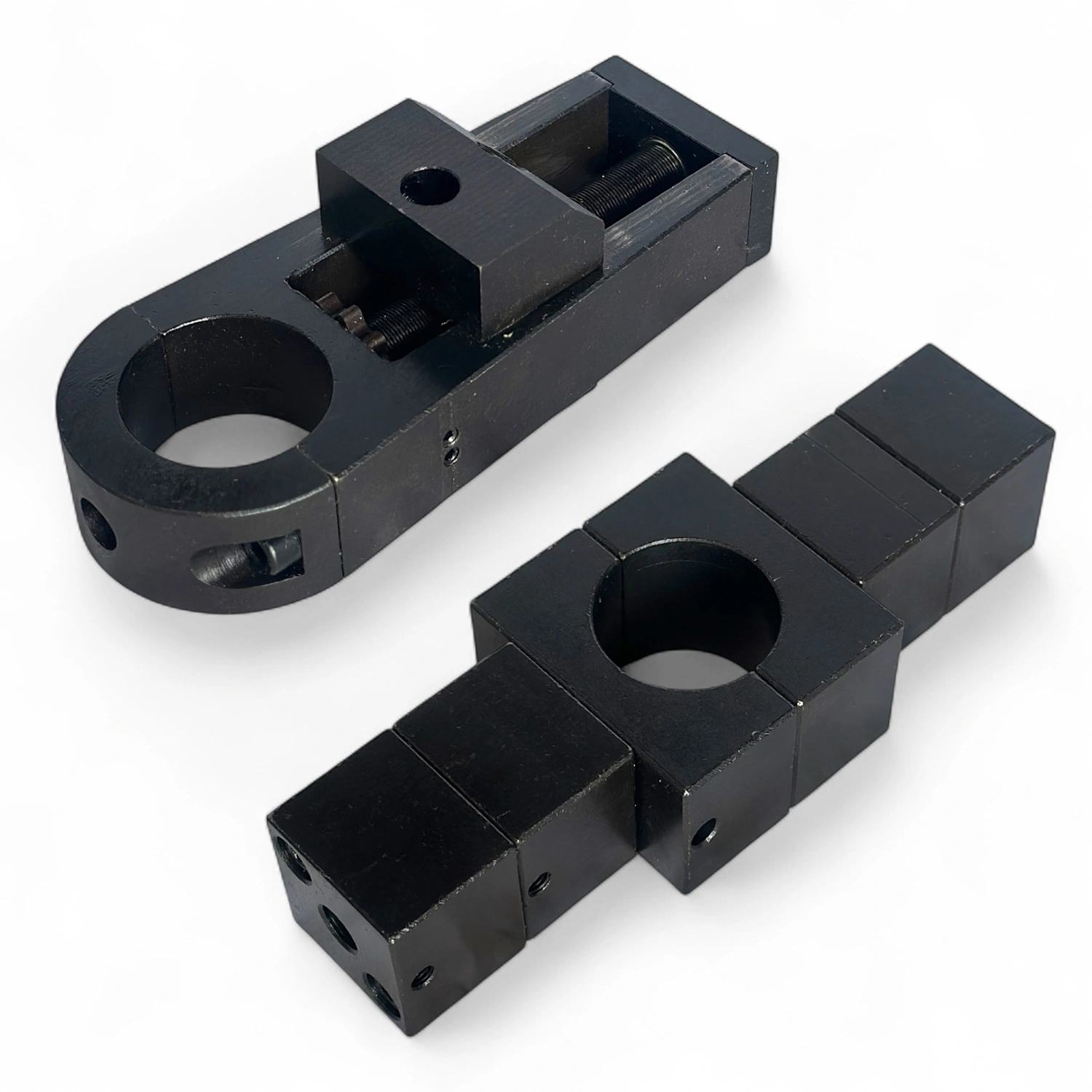 Другий важливий елемент – обойми кріплення станка безпосередньо до отвору, виготовлені з легованої сталі. У кожній встановлено по два підшипники, вони мають Г-подібні лапки та болти з регулюванням діаметром 20 мм, що забезпечує жорстке кріплення станка до деталі.