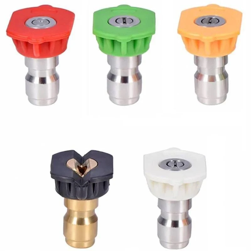Набір з 5 насадок з швидкоз’ємним кріпленням призначений для мийок з тиском від 100 бар до 300 бар. Він забезпечує ефективне миття машин, брущаток, фасадів та інших поверхонь, надаючи різні типи струменя для оптимального очищення. Ідеально підходять як для професійного використання, так і для домашнього обслуговування.