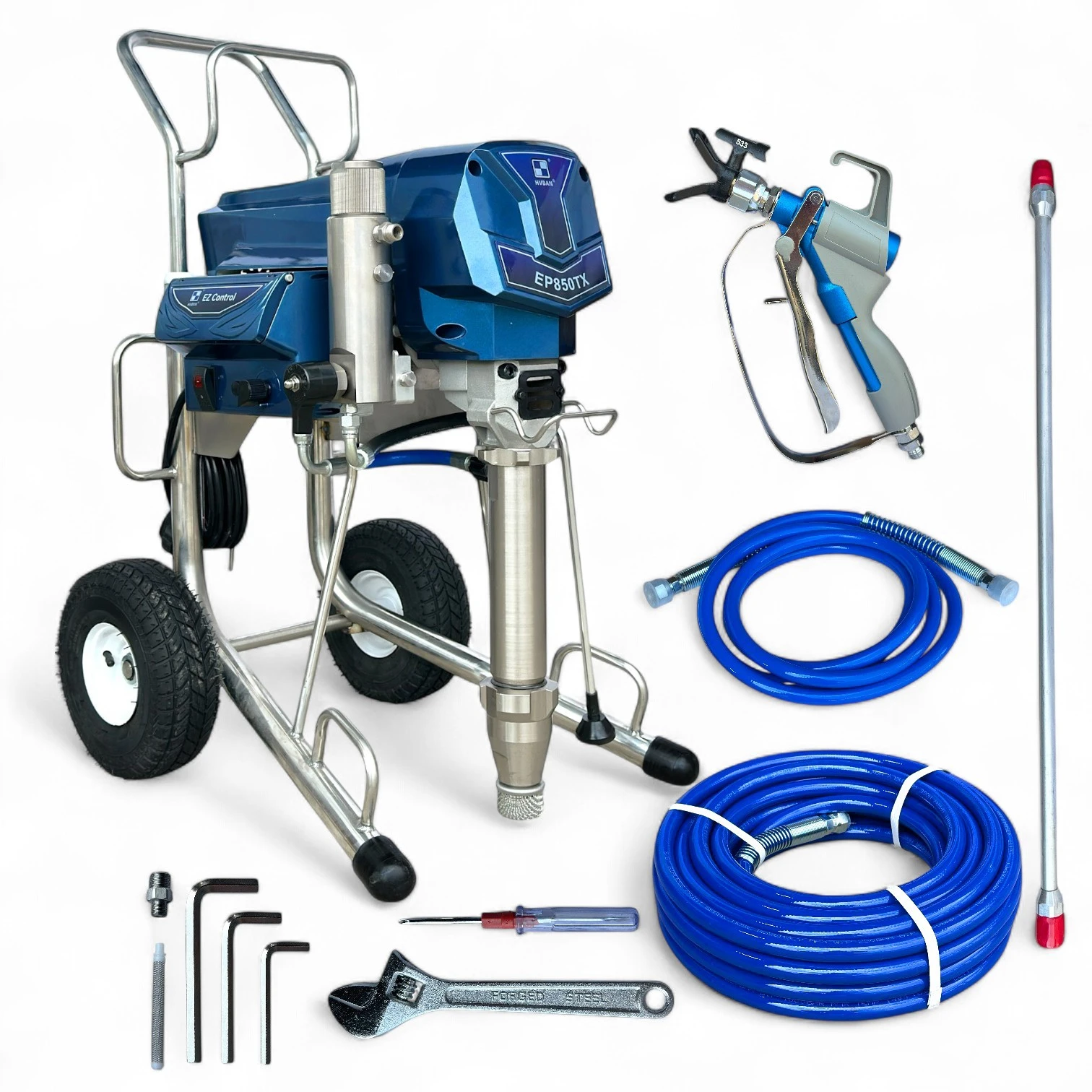 Безповітряний фарбувальний апарат HVBAN EP-850TX — це потужний і надійний професійний інструмент преміум-класу, оснащений поршневим насосом збільшеного діаметра та високопродуктивним вхідним клапаном, який ефективно наносить широкий спектр високов’язких матеріалів, таких як вогнезахисні засоби, гіпсові та акрилові шпаклівки, гідроізоляція, рідка гума, фарба, клей для стеклохолста та інші густі будівельні суміші, що робить його ідеальним вибором для будівельних бригад, професійних малярів і спеціалістів на складних промислових та приватних об’єктах будь-якого рівня складності.