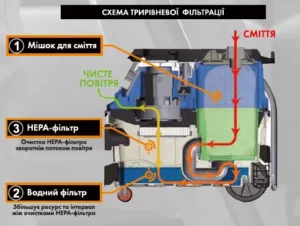 - Пилосос має систему зворотного обдування для видалення пилу з фільтра та запобігання його засміченню;