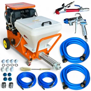 Шпаклювально-штукатурна станція зі шнековим насосом та вбудованим чотирициліндровим безмасляним компресором призначена для подачі та нанесення готових будівельних розчинів під тиском до 30 бар із подальшим розпиленням за допомогою стисненого повітря.