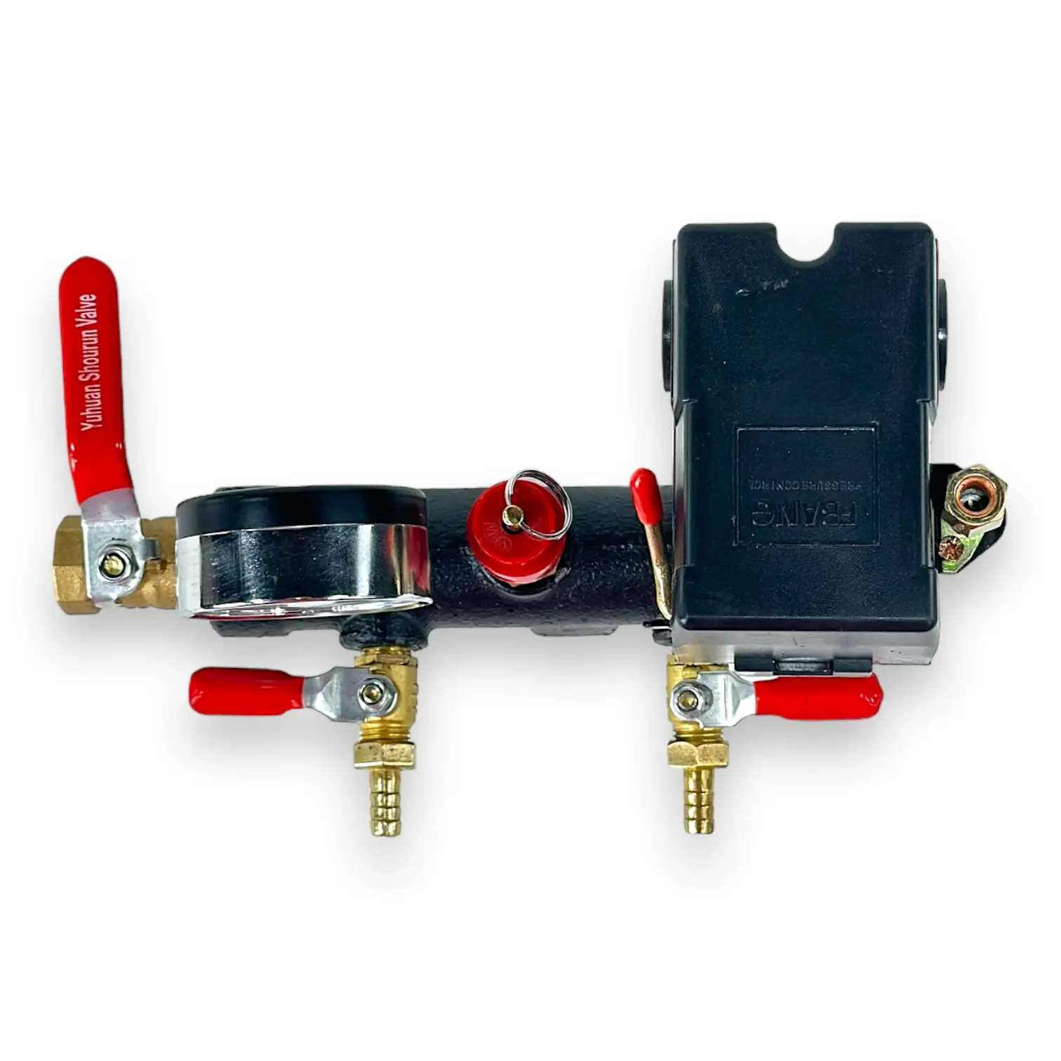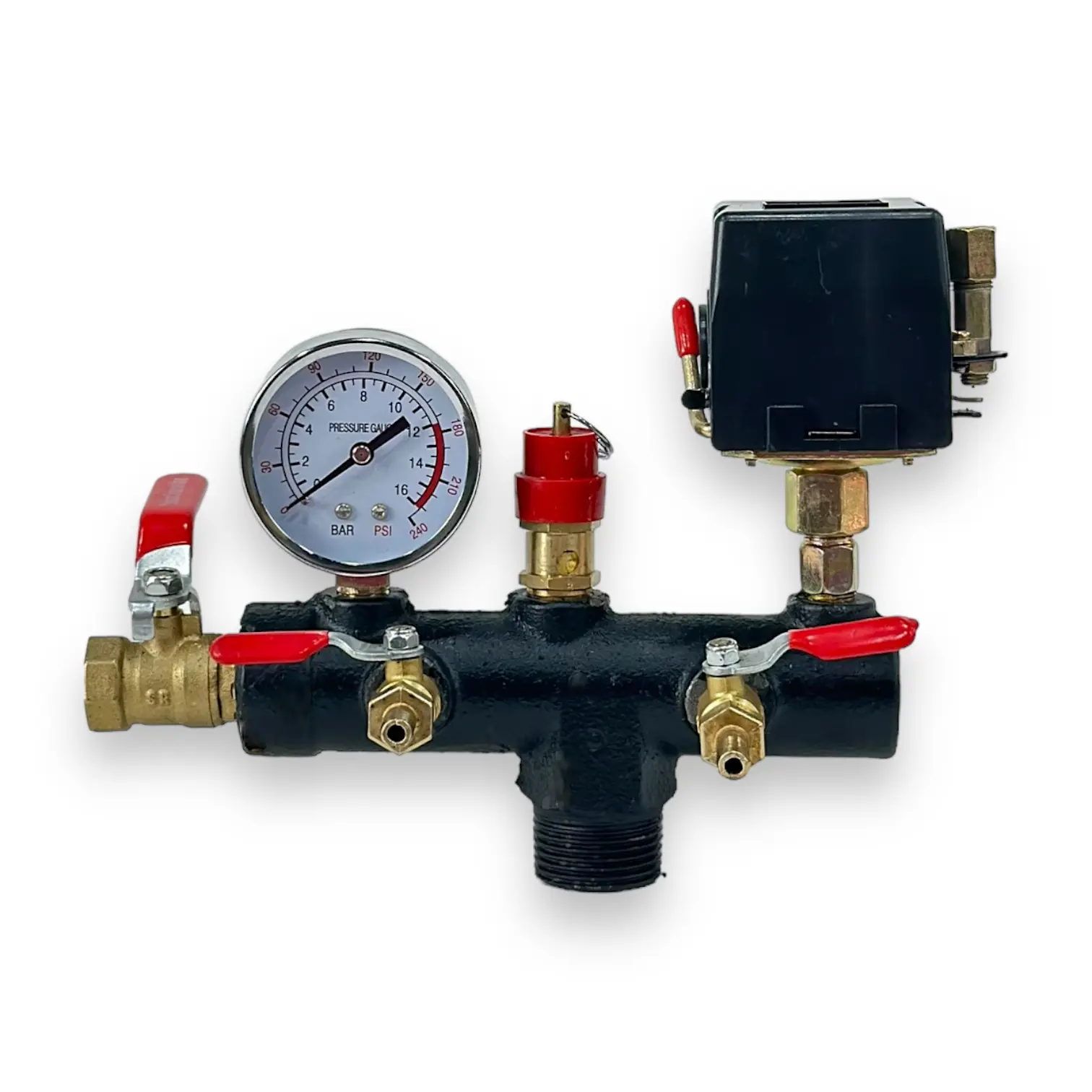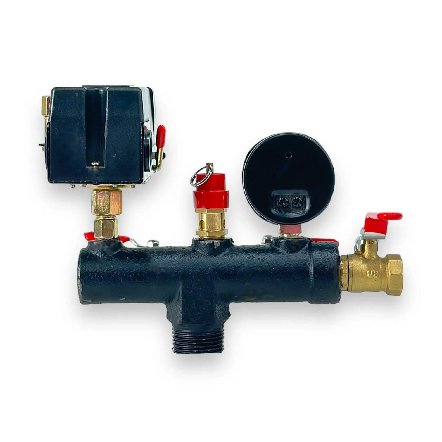 - Прессостат (или реле давления): автоматически регулирует работу компрессора, включая его при понижении давления до установленного минимума и выключая при достижении максимального давления.