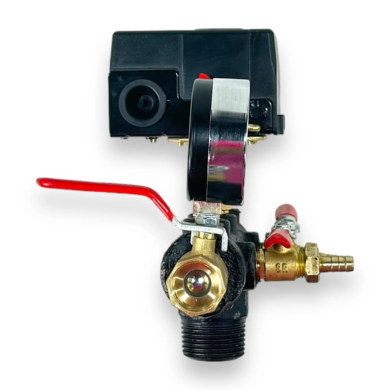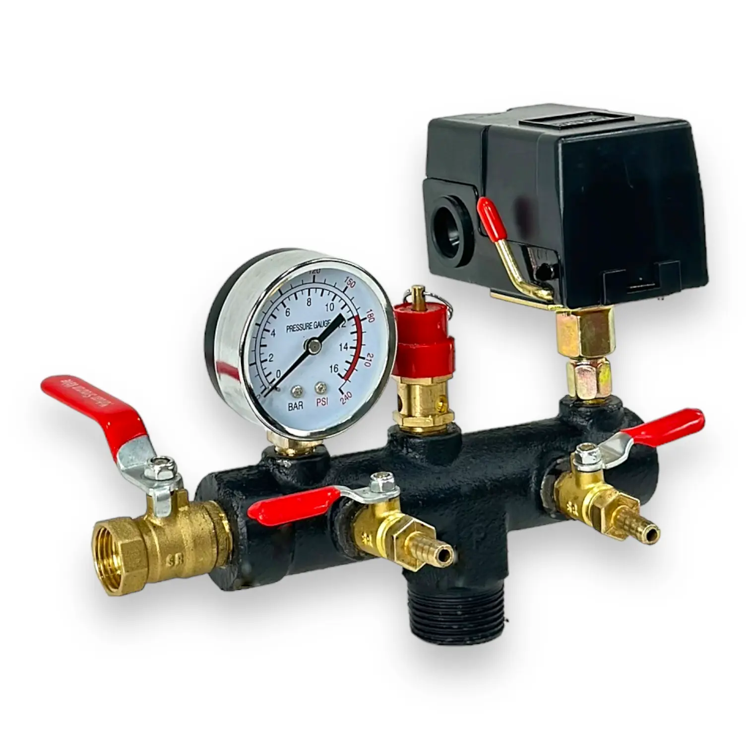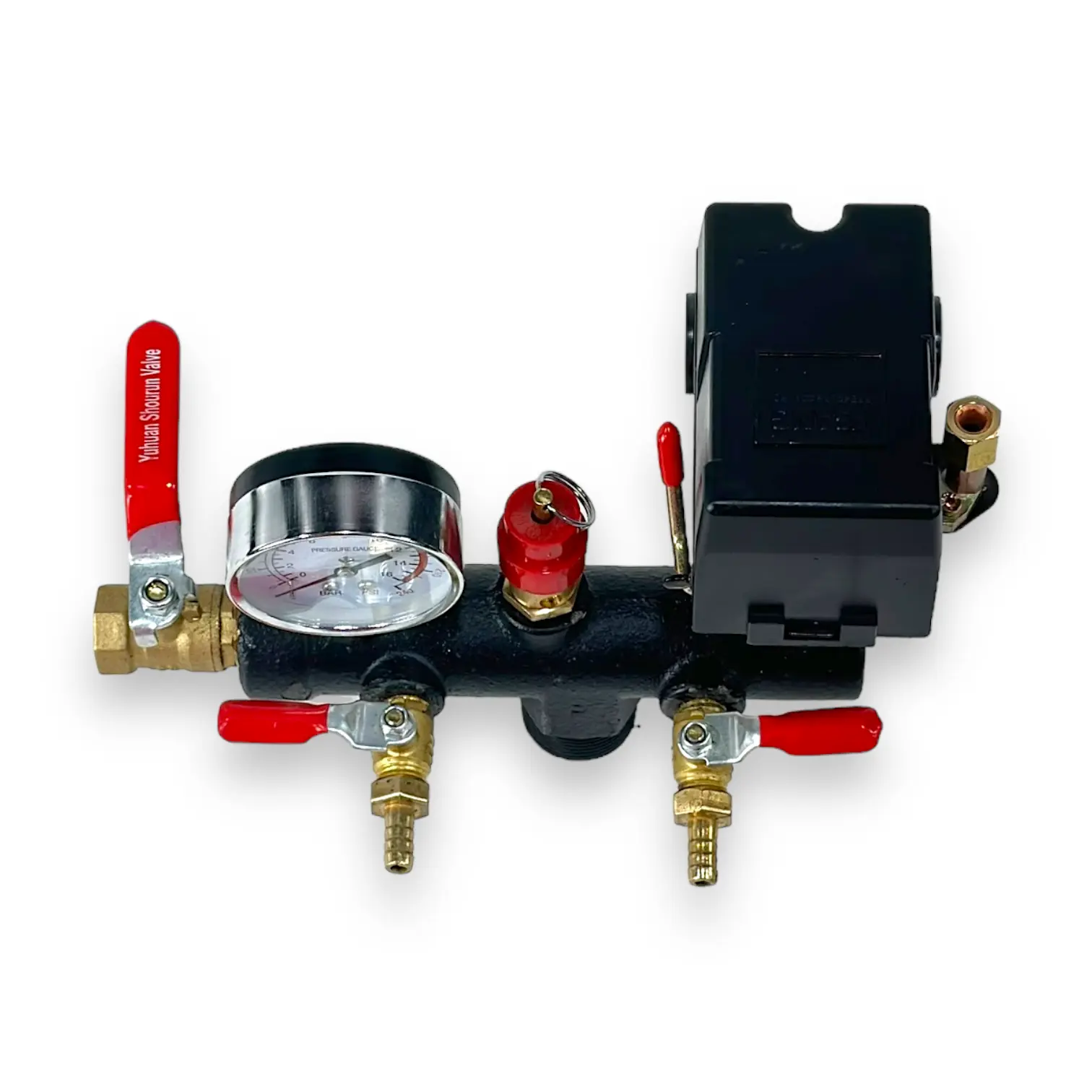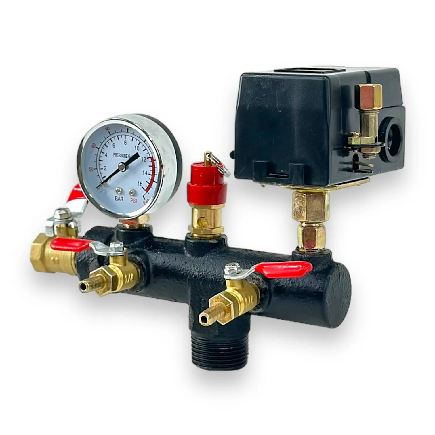 - Прессостат (или реле давления): автоматически регулирует работу компрессора, включая его при понижении давления до установленного минимума и выключая при достижении максимального давления.