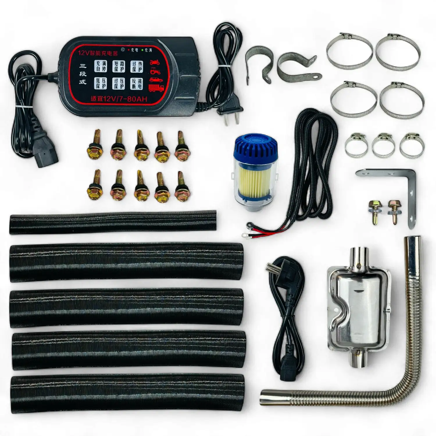 В комплекте идёт все необходимое для полного монтажа автономного обогревателя Profinstrument. Установка проста, понятна и доступна, а каждый этап можно выполнить самостоятельно. Дополнительно комплект включает в себя подробную инструкцию для легкого и быстрого монтажа.
