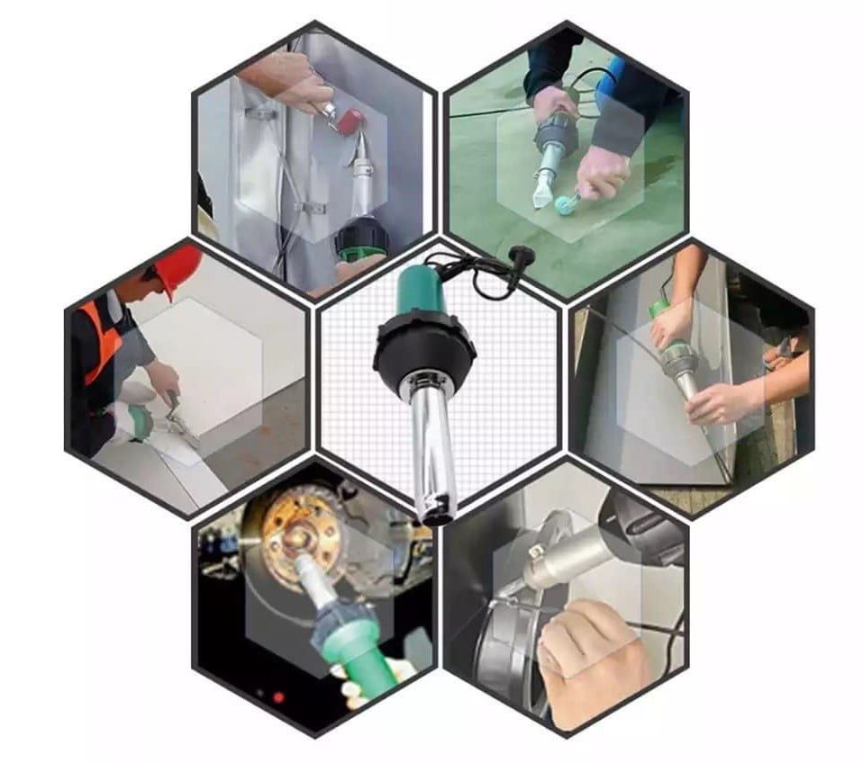 Комплект используется, в частности, для сушки, склеивания, деформации, стыковки труб и профилей, а также для снятия лакокрасочных материалов. Тепловая пушка подходит для сварки любого типа пластика, даже если материал не сварен стандартными связующими. В комплект входят специальные насадки для сварки, например, автомобильных бамперов.