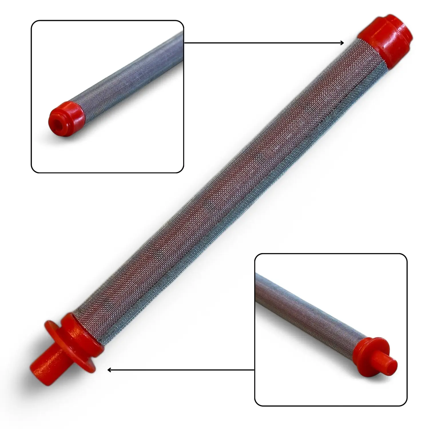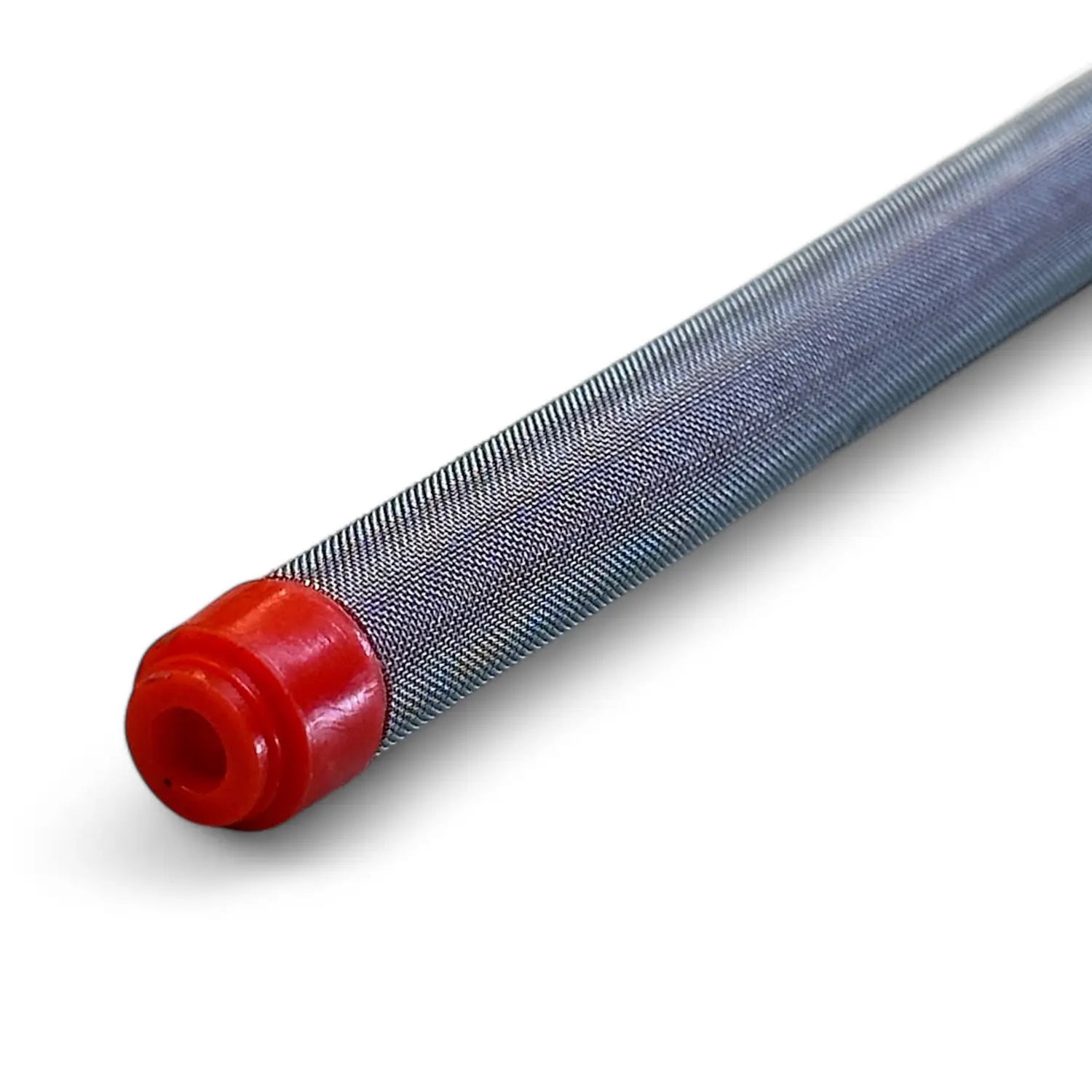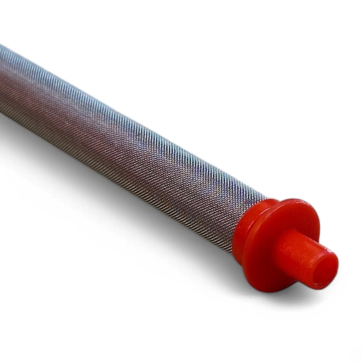 Фильтр тонкой очистки для распылительного оборудования 150 Mesh Фильтр предназначен для установки в ручку безвоздушного окрасочного пистолета и служит для тонкой фильтрации краски. Краска перед попаданием в фильтр тонкой очистки уже проходит через фильтр грубой очистки (на всасывающем шланге), фильтр предварительной очистки (в колбе узла заполнения насоса, в поршневых аппаратах). Фильтр состоит из пластикового цилиндра с круглыми отверстиями на поверхности, обтянутого металлической сеткой.