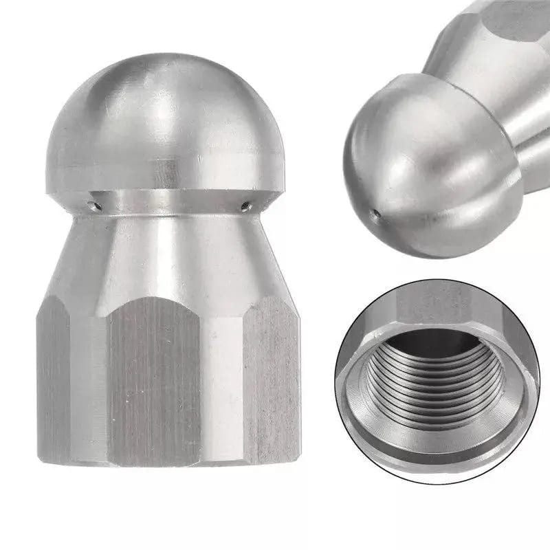 Форсунка для чистки канализации может быть присоединена к Karcher или обычному шлангу. Она изготовлена из нержавеющей стали, что делает ее устойчивой к ржавчине. Есть переднее отверстие для удаления засоров и три задних отверстия для смывания мусора. Работает при давлении до 4000 PSI, подходит для разных труб, включая канализационные.
