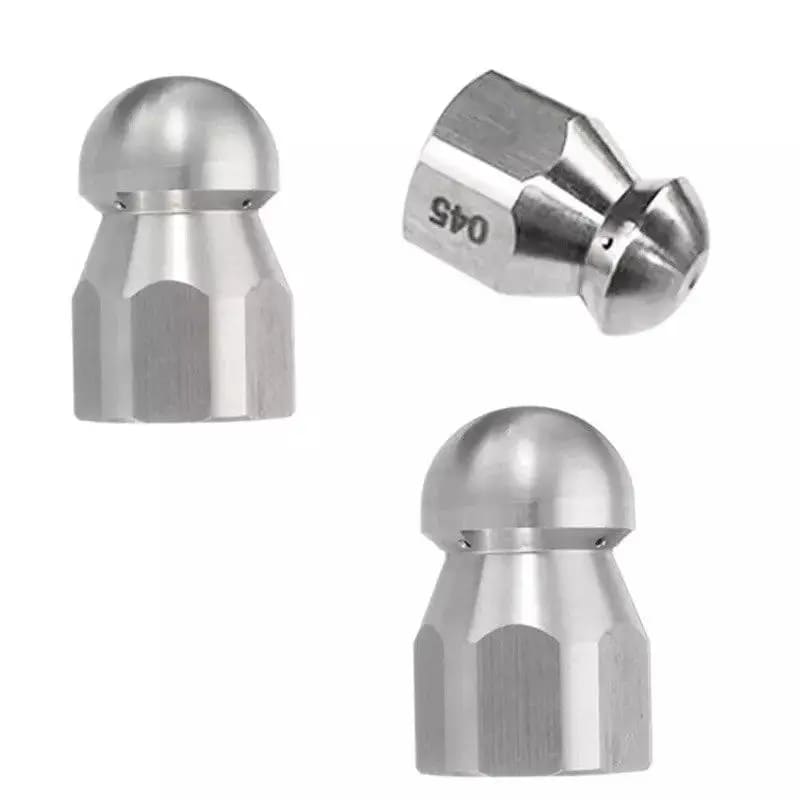 Форсунка для чистки канализации может быть присоединена к Karcher или обычному шлангу. Она изготовлена из нержавеющей стали, что делает ее устойчивой к ржавчине. Есть переднее отверстие для удаления засоров и три задних отверстия для смывания мусора. Работает при давлении до 4000 PSI, подходит для разных труб, включая канализационные.