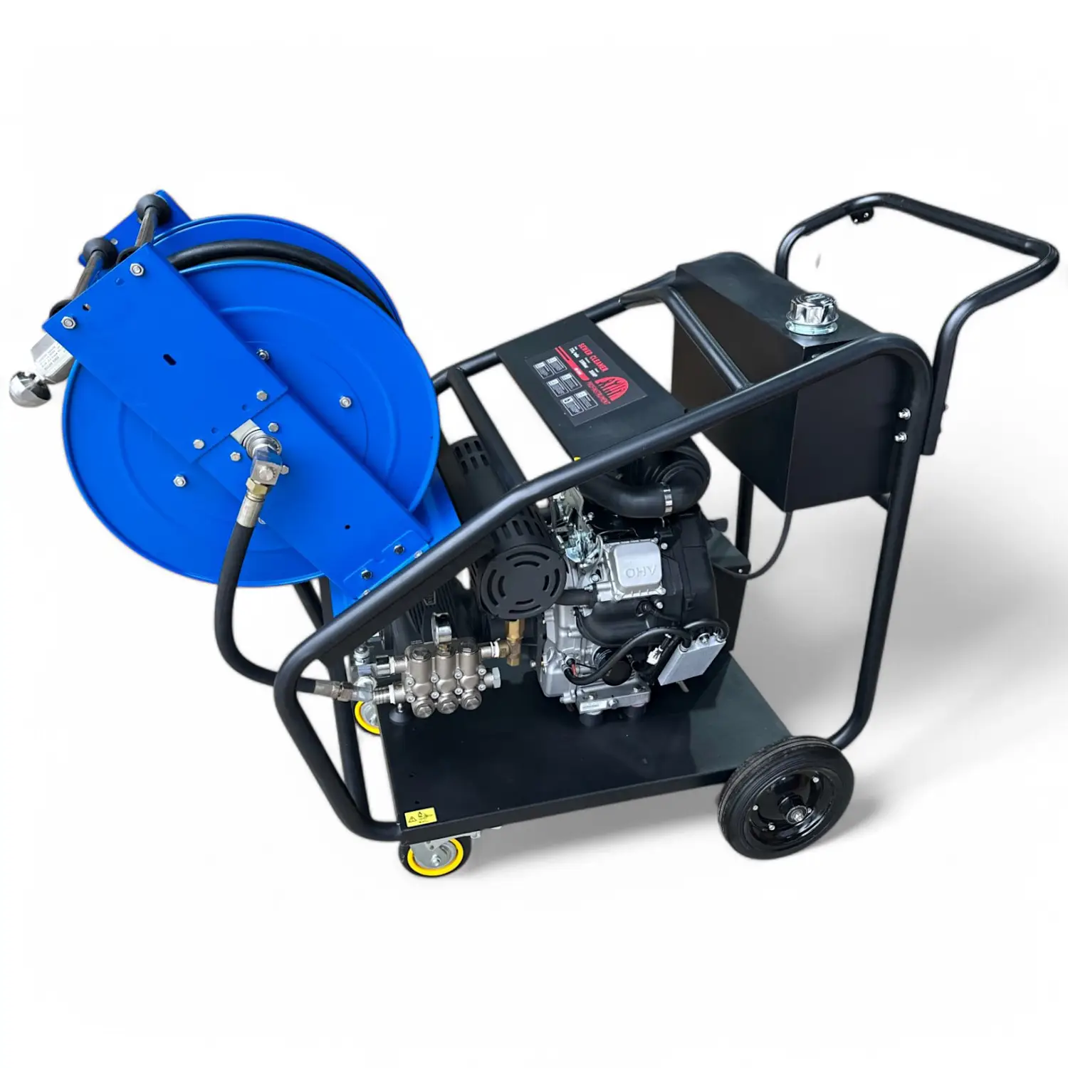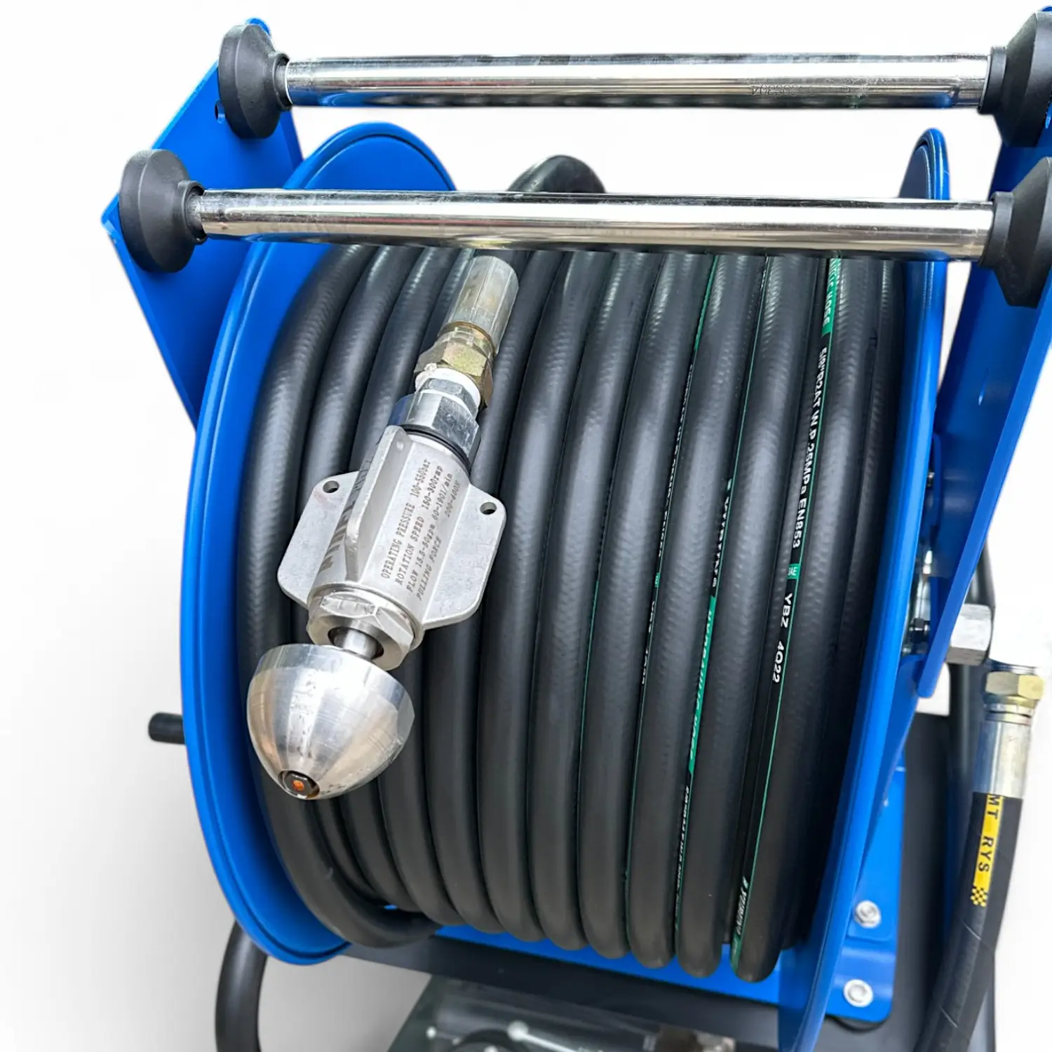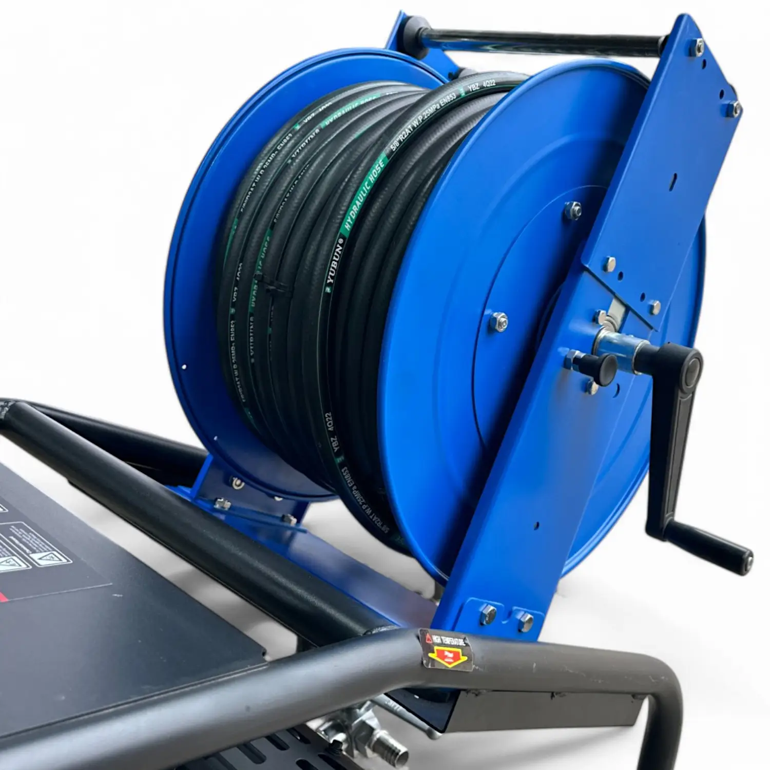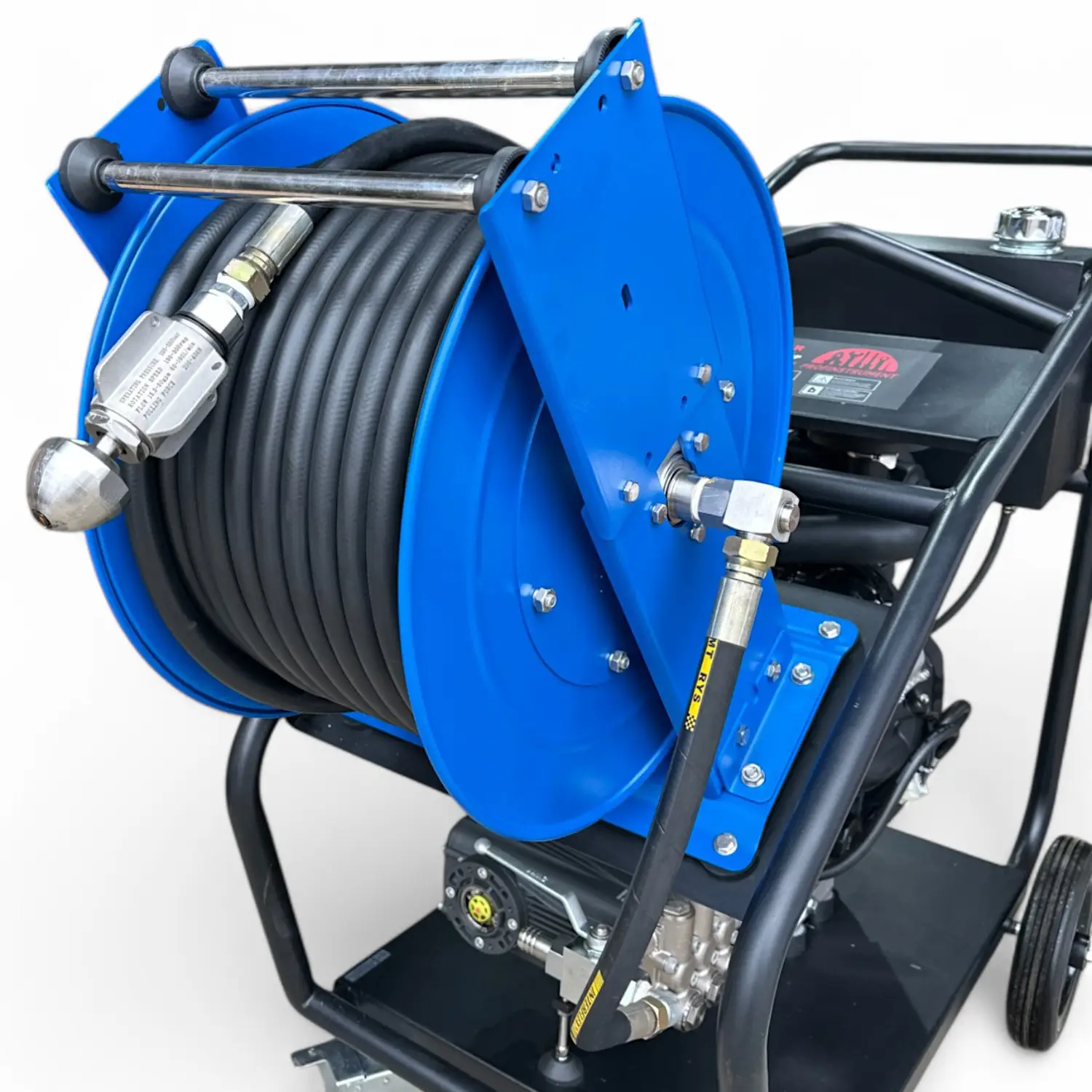 Катушка с барабаном, изготовленным из прочной стали, установлена на раме с транспортировочными колесами, что облегчает перемещение машины даже через дверные проемы благодаря компактной конструкции. Дополнительно можно купить пистолет высокого давления для мойки автотранспорта, зданий и других поверхностей.