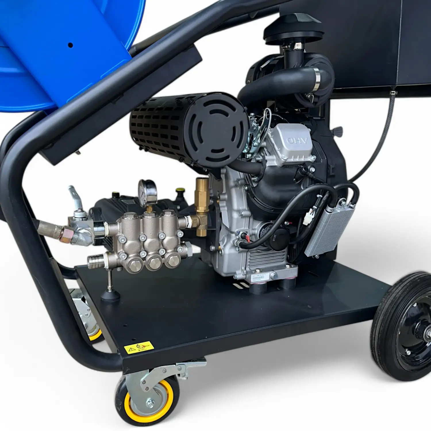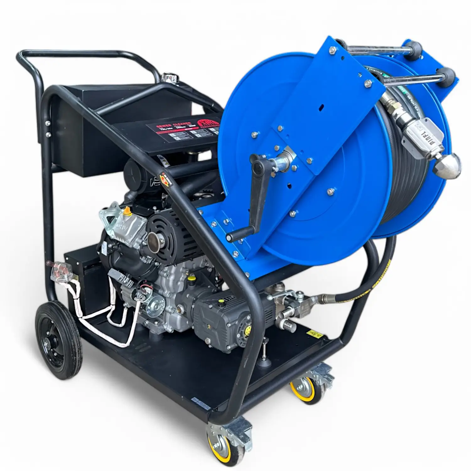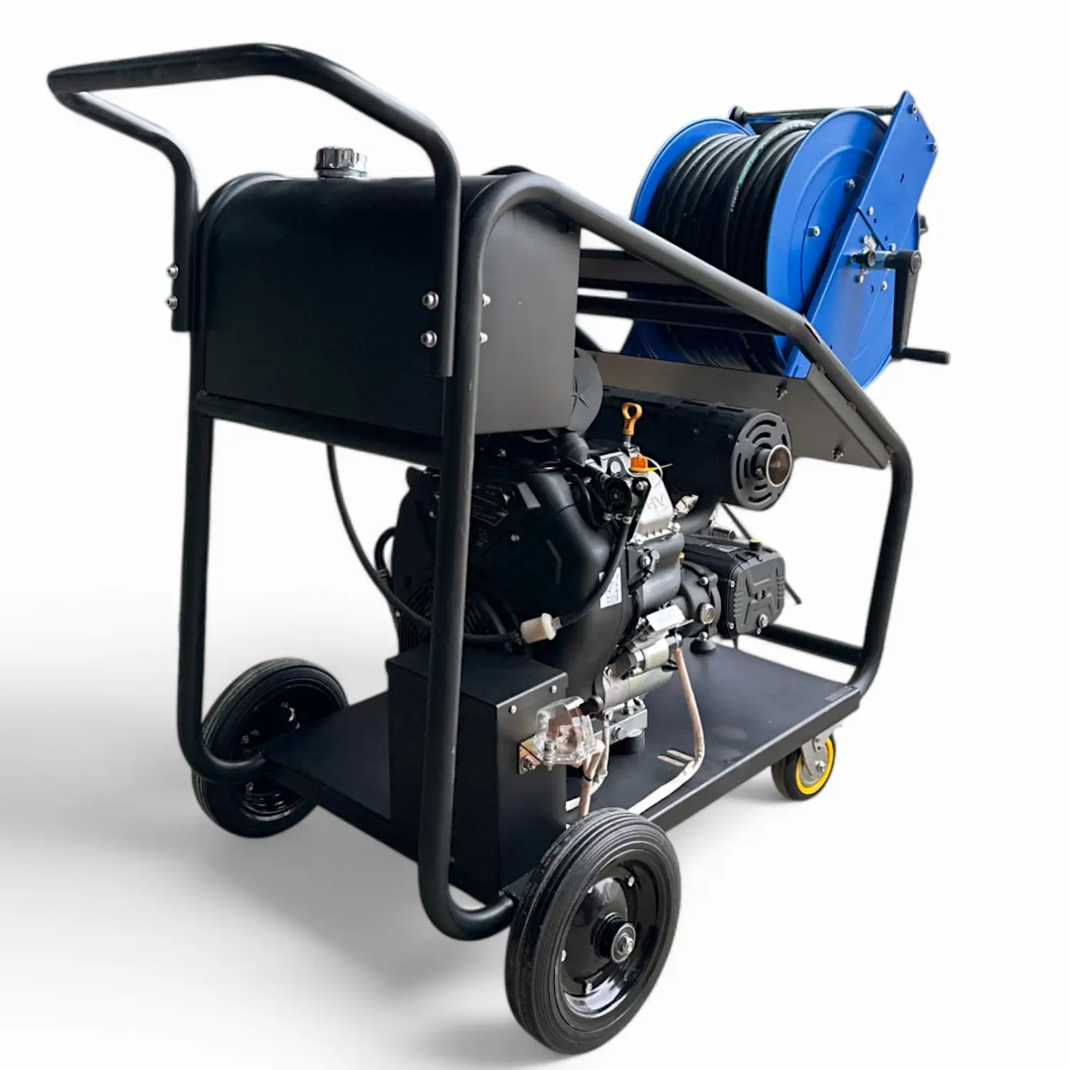 Катушка с барабаном, изготовленным из прочной стали, установлена на раме с транспортировочными колесами, что облегчает перемещение машины даже через дверные проемы благодаря компактной конструкции. Дополнительно можно купить пистолет высокого давления для мойки автотранспорта, зданий и других поверхностей.