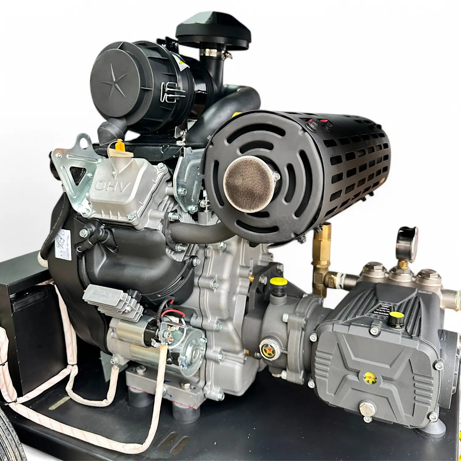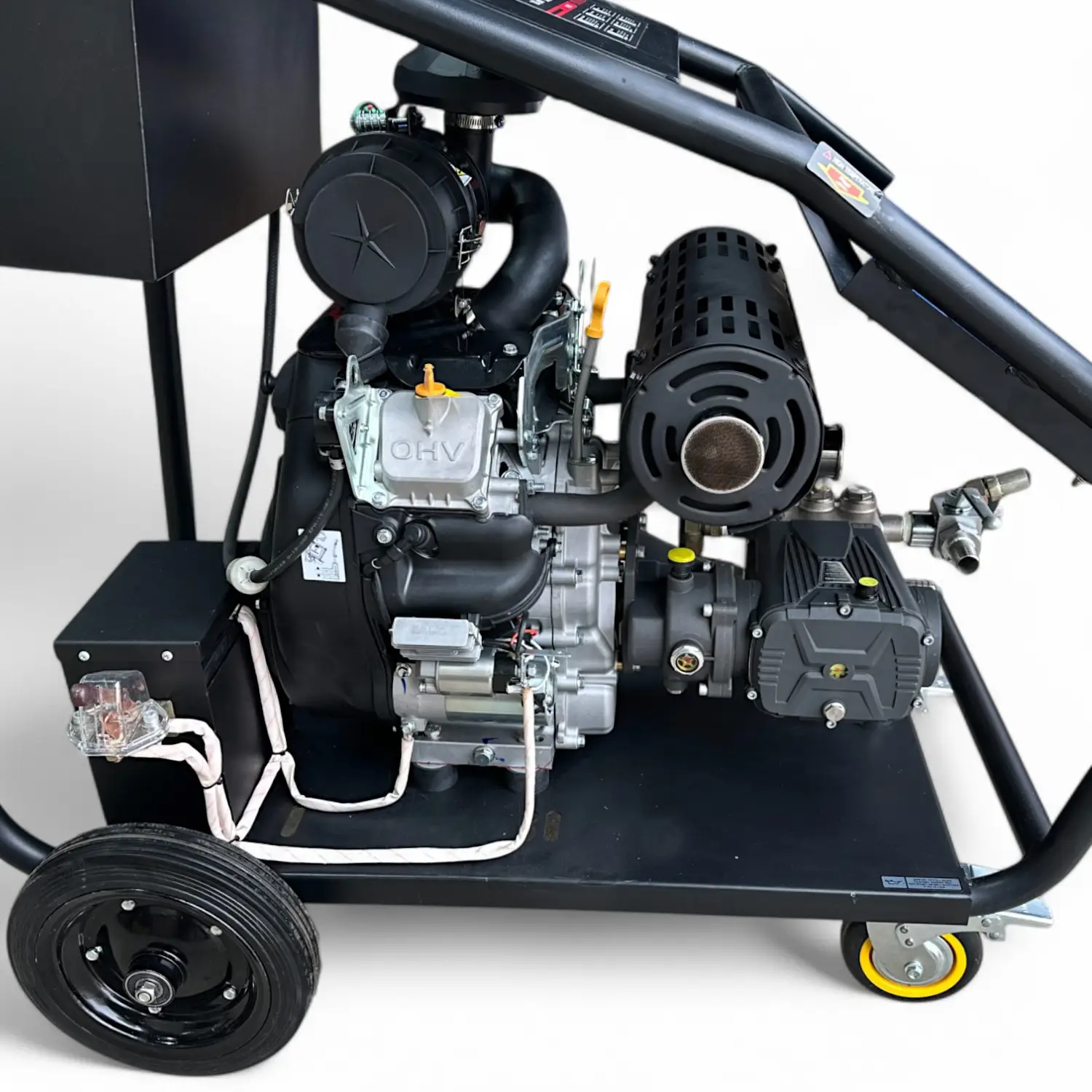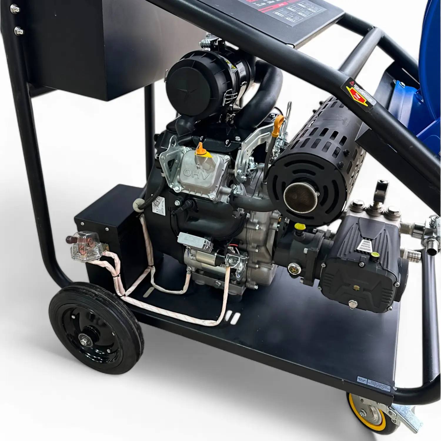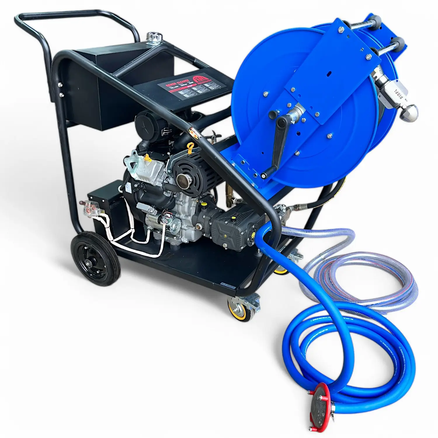 Катушка с барабаном, изготовленным из прочной стали, установлена на раме с транспортировочными колесами, что облегчает перемещение машины даже через дверные проемы благодаря компактной конструкции. Дополнительно можно купить пистолет высокого давления для мойки автотранспорта, зданий и других поверхностей.