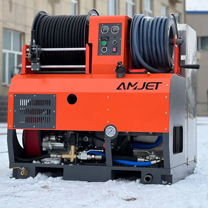 Прочисна гідродинамічна каналопромивна машина з бензиновим двигуном, призначена для прочищення та промивання трубопроводів діаметром від 50мм до 600мм та довжиною до 100м, що забезпечує зручність в роботі на великих відстанях.