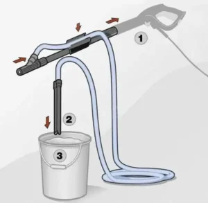 - Подключение: Подключите пескоструй к шлангу мойки высокого давления.