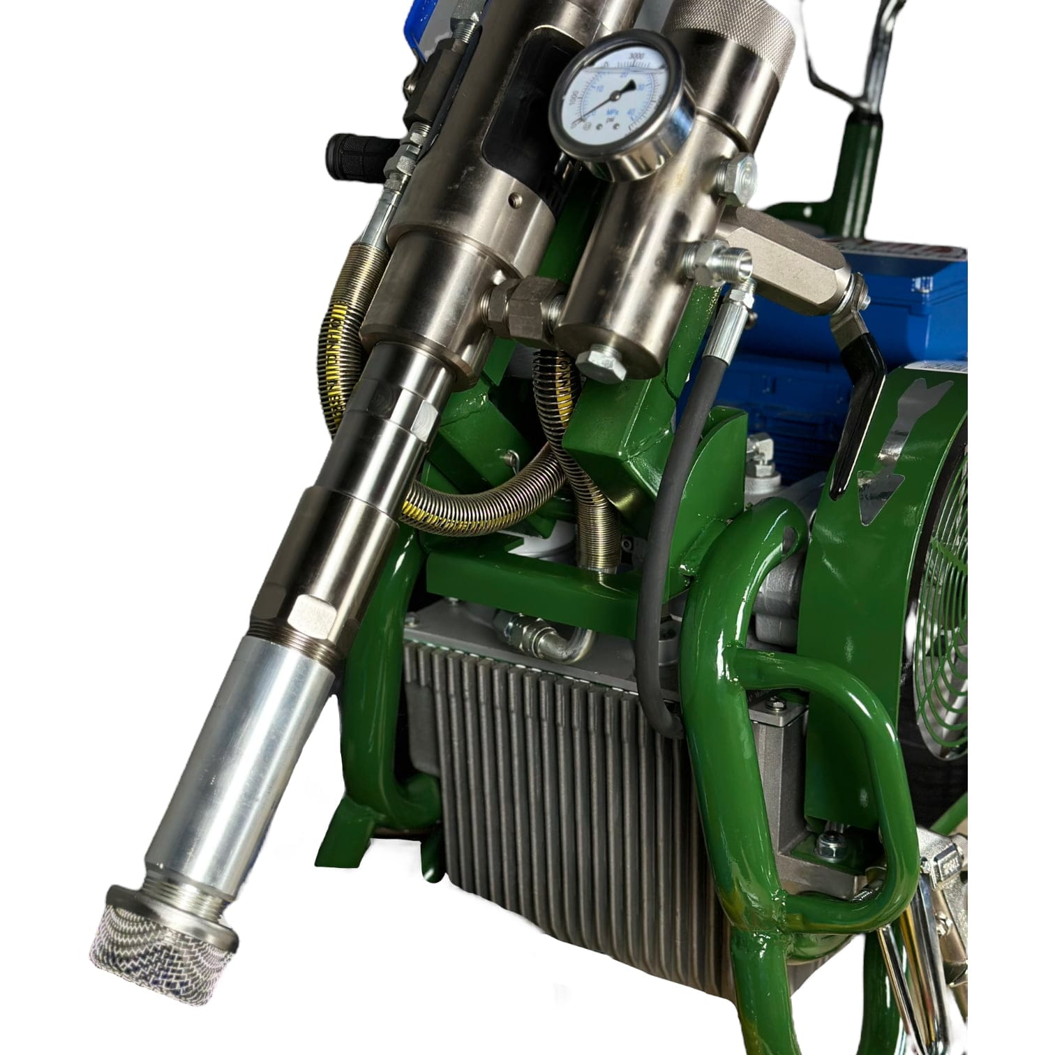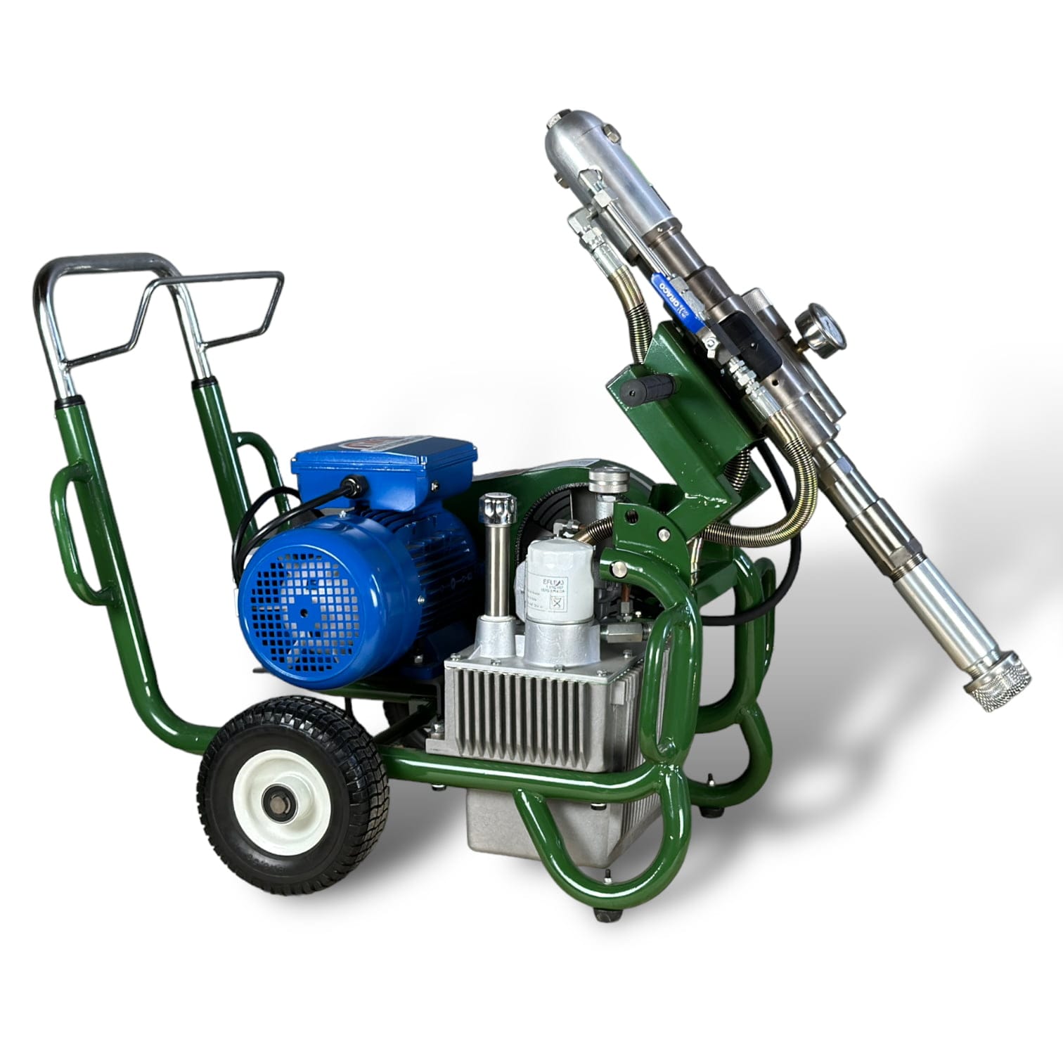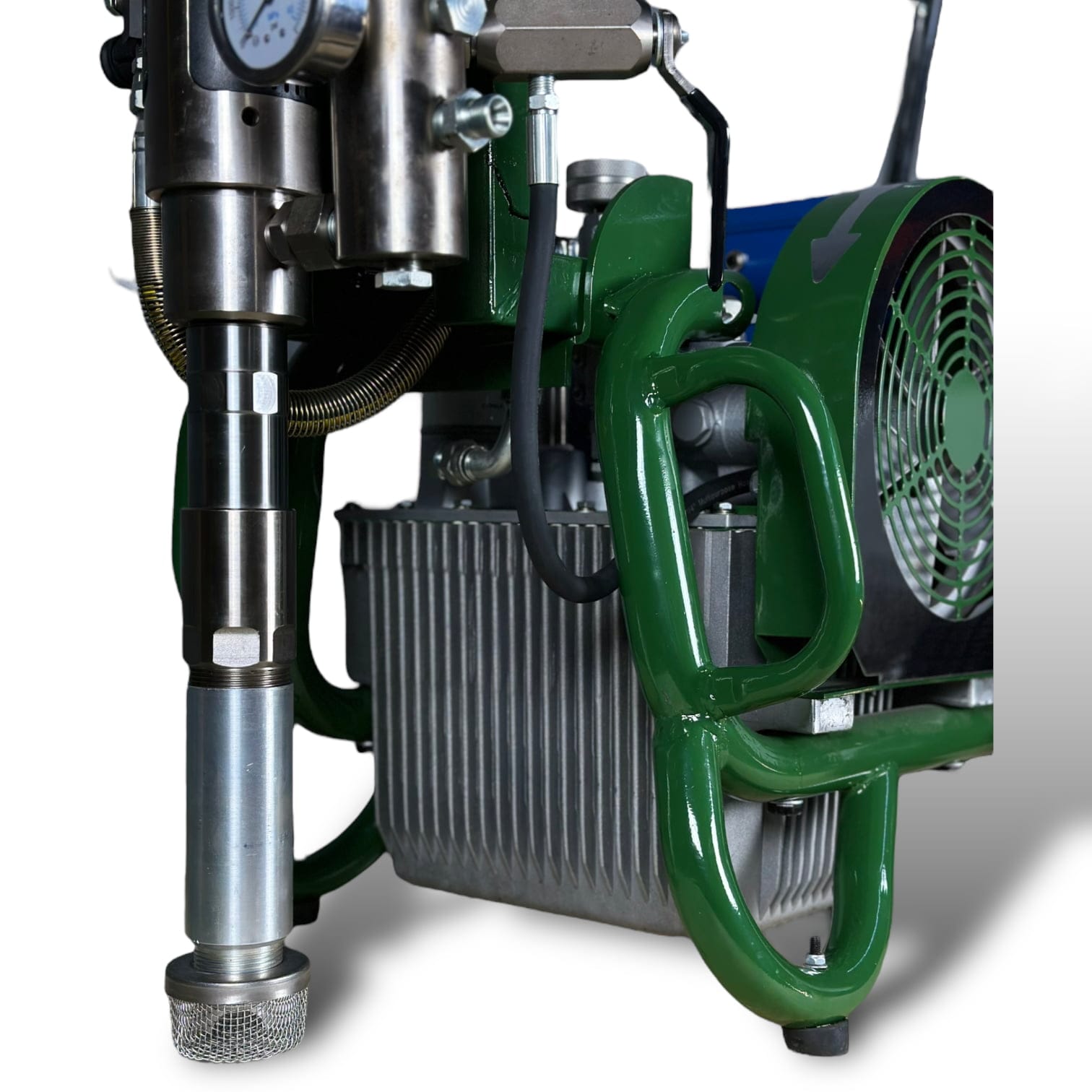 Гидропоршневой насос агрегата приводится в действие гидросистемой, которая, в свою очередь, приводится в действие электрическим двигателем. Гидропоршневая система позволяет работать гораздо эффективнее, чем классические поршневые покрасочные аппараты с электродвигателем.