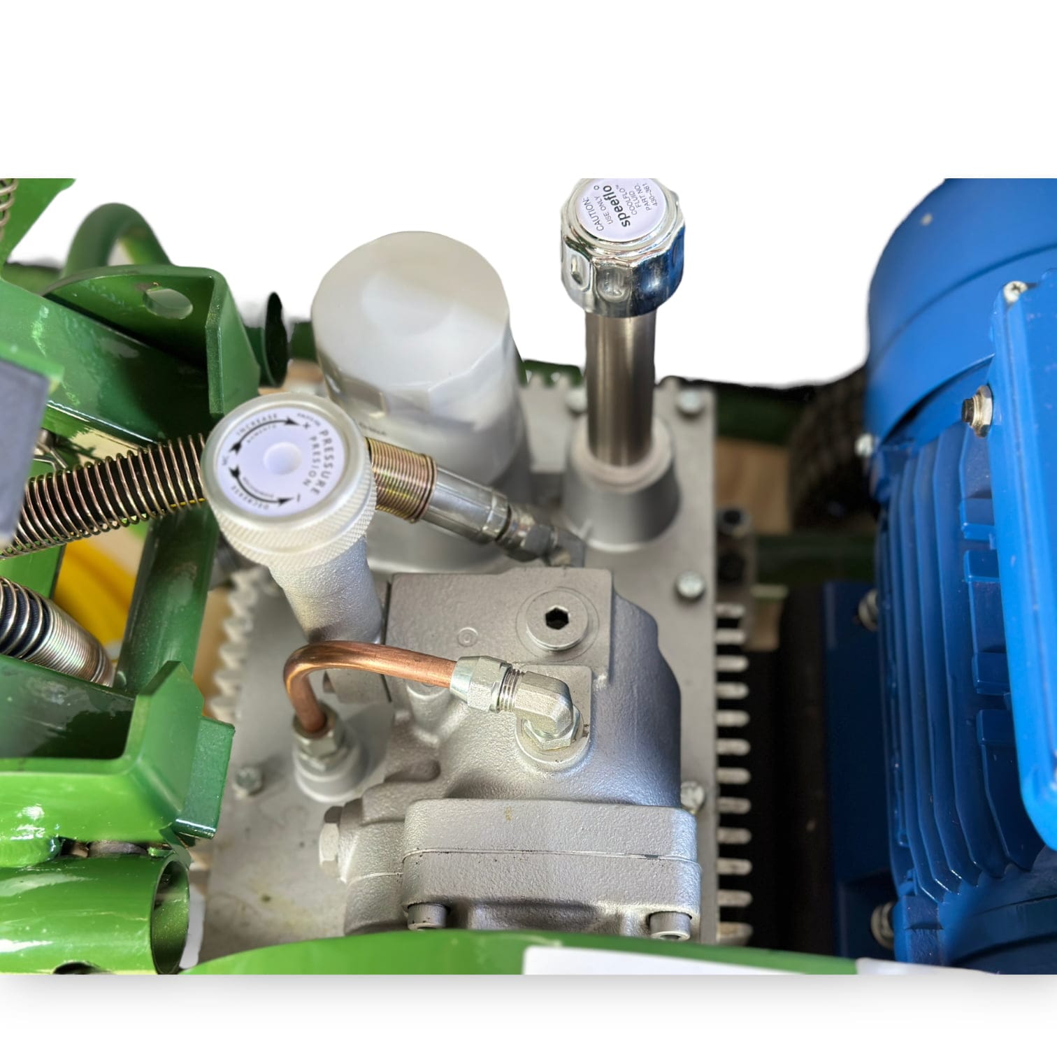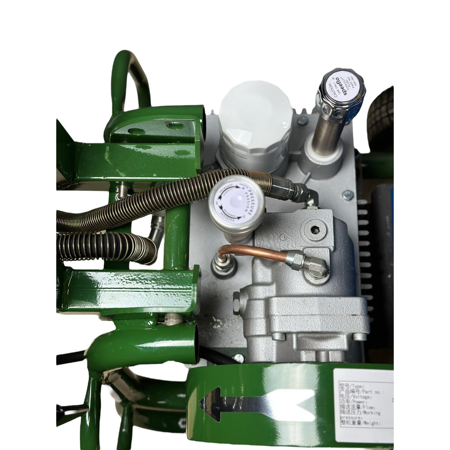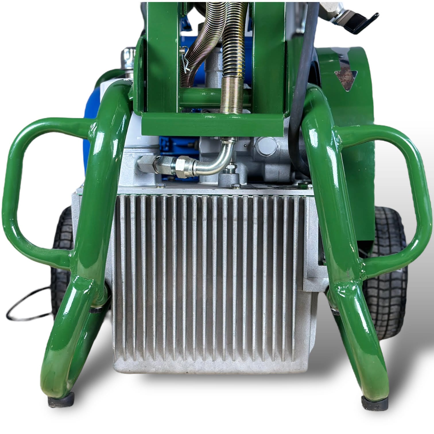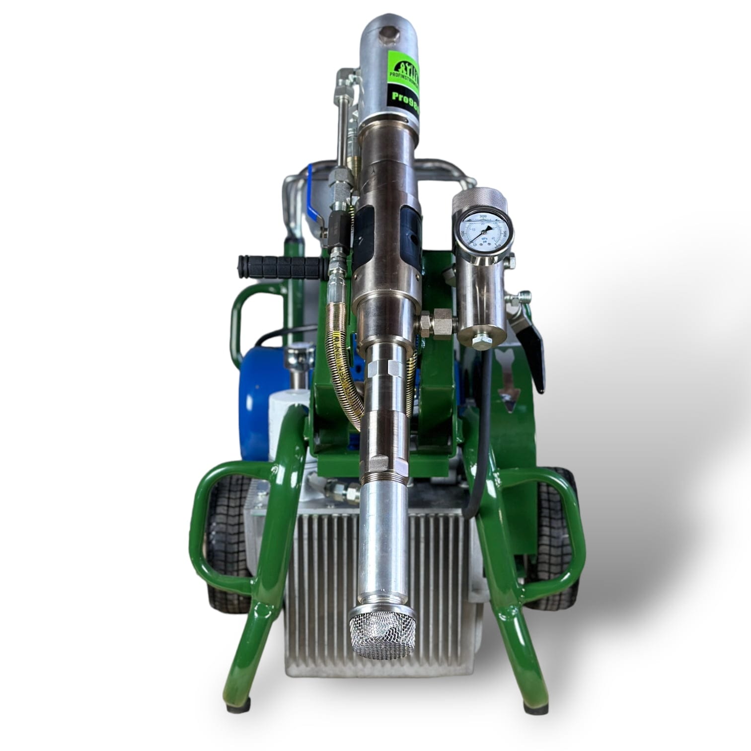 Гидропоршневой насос агрегата приводится в действие гидросистемой, которая, в свою очередь, приводится в действие электрическим двигателем. Гидропоршневая система позволяет работать гораздо эффективнее, чем классические поршневые покрасочные аппараты с электродвигателем.