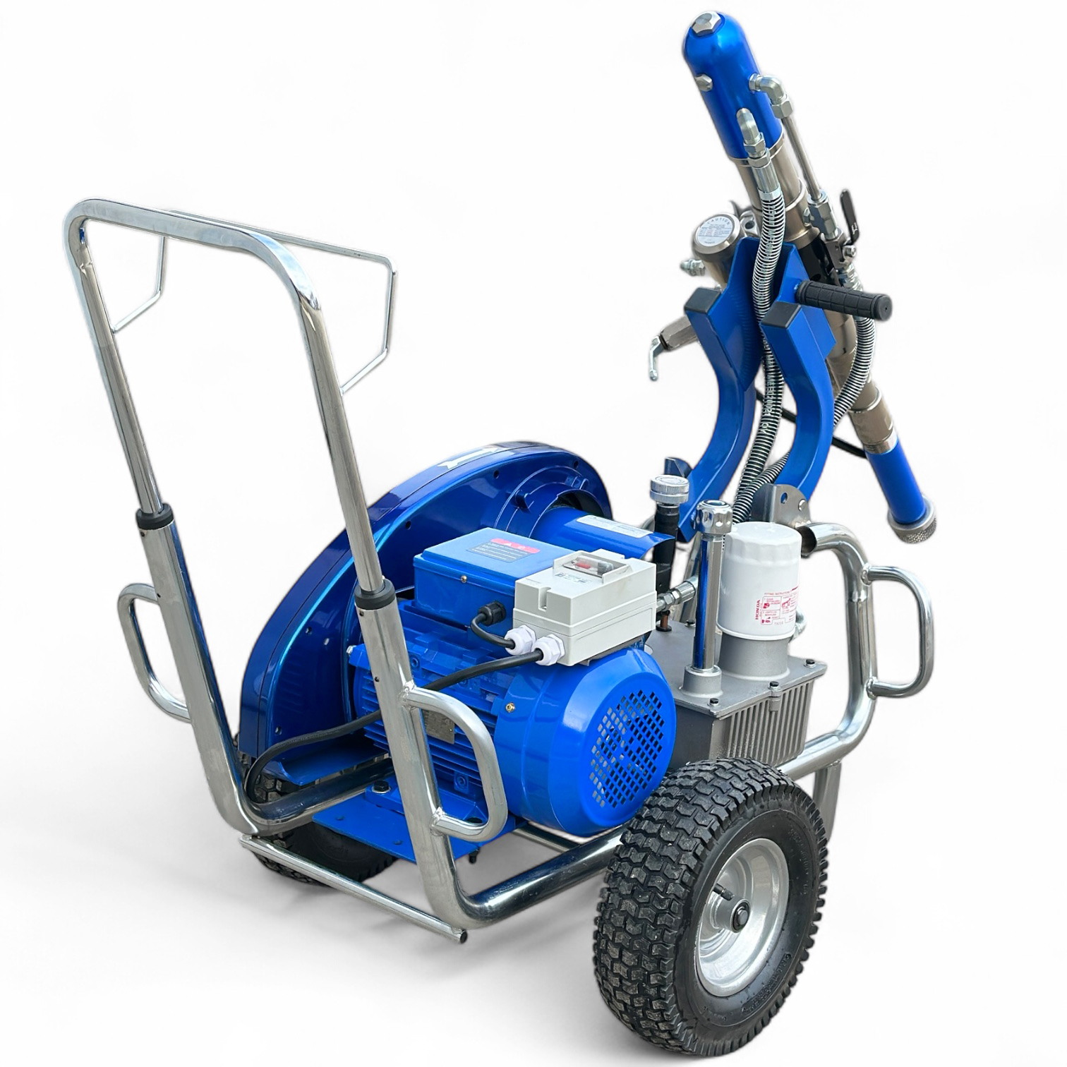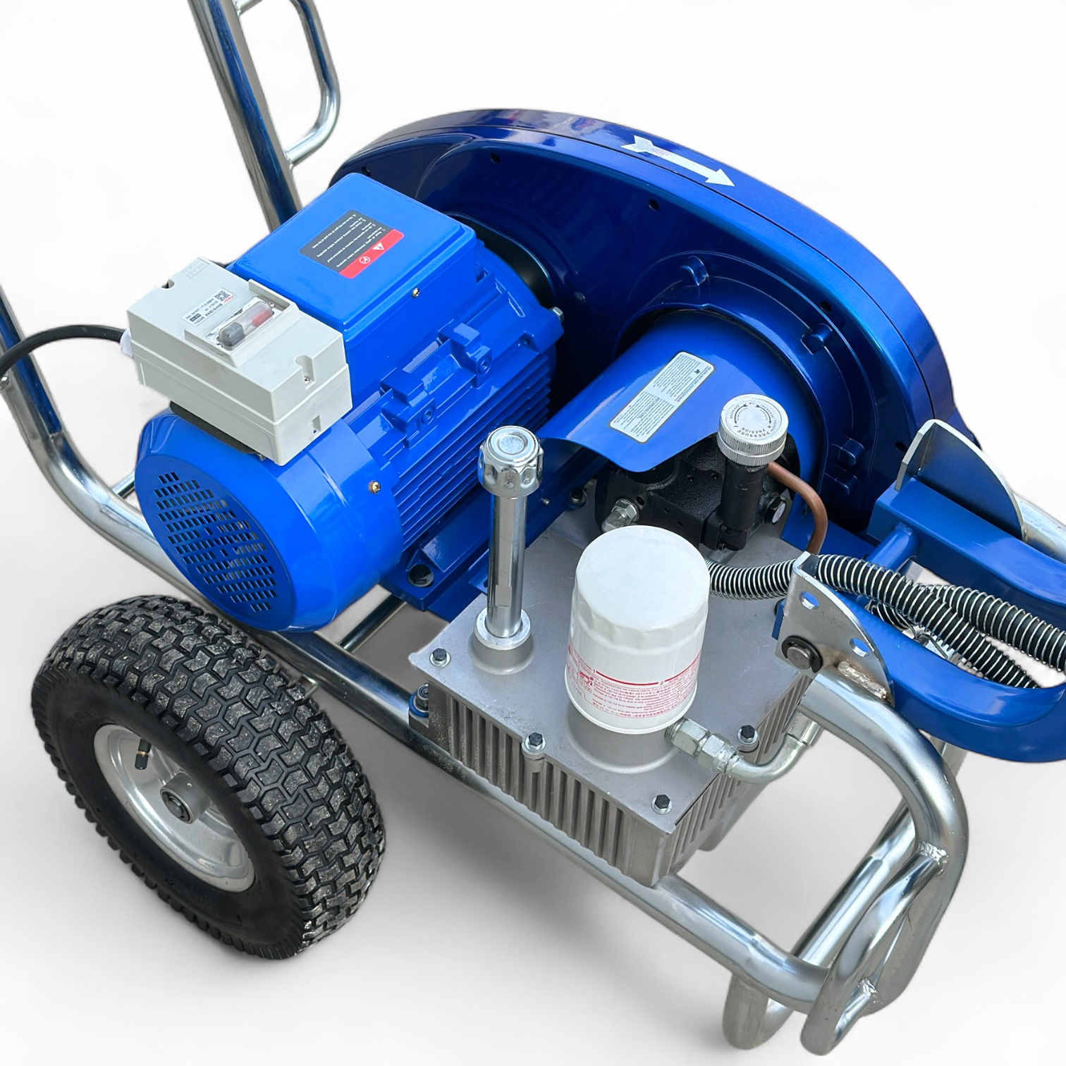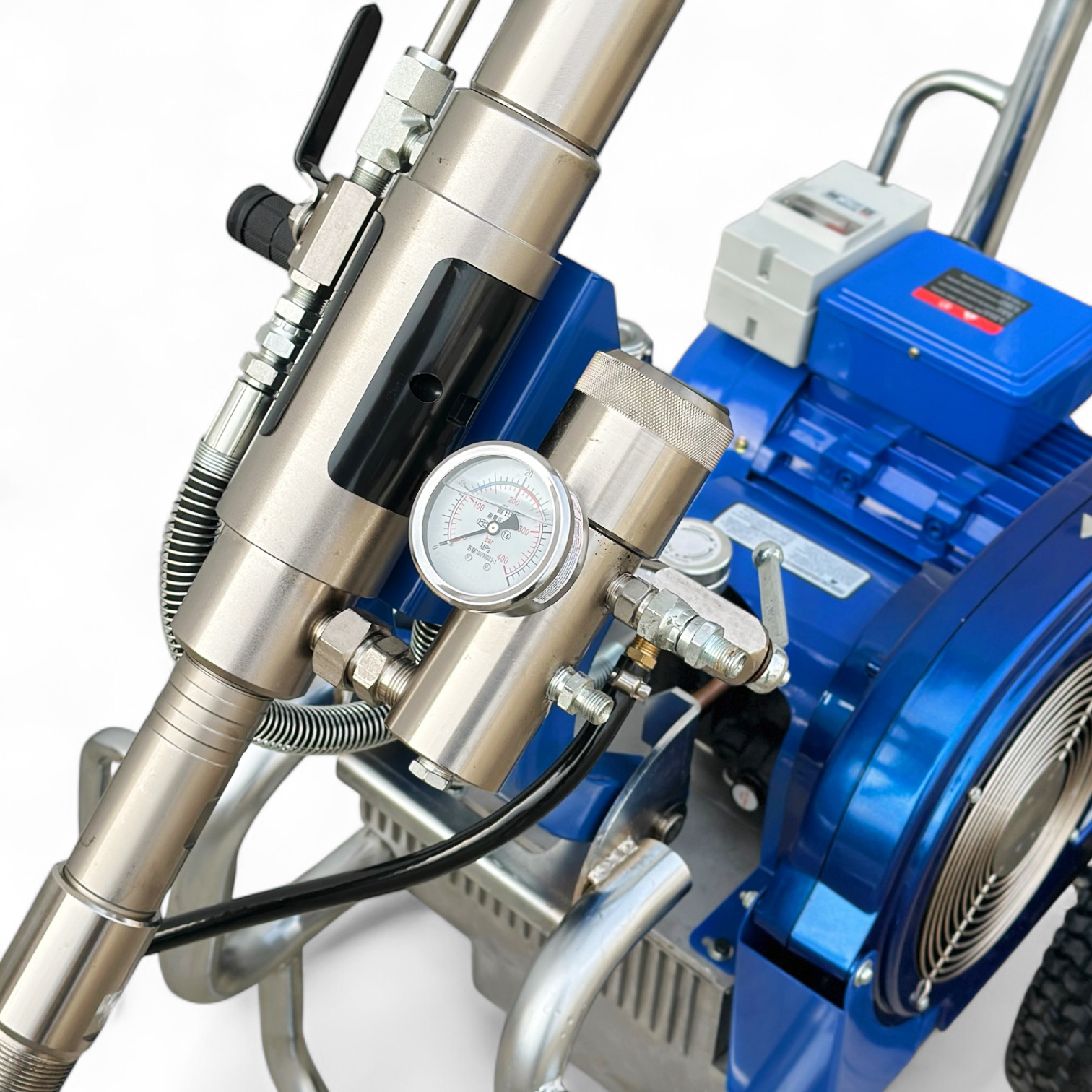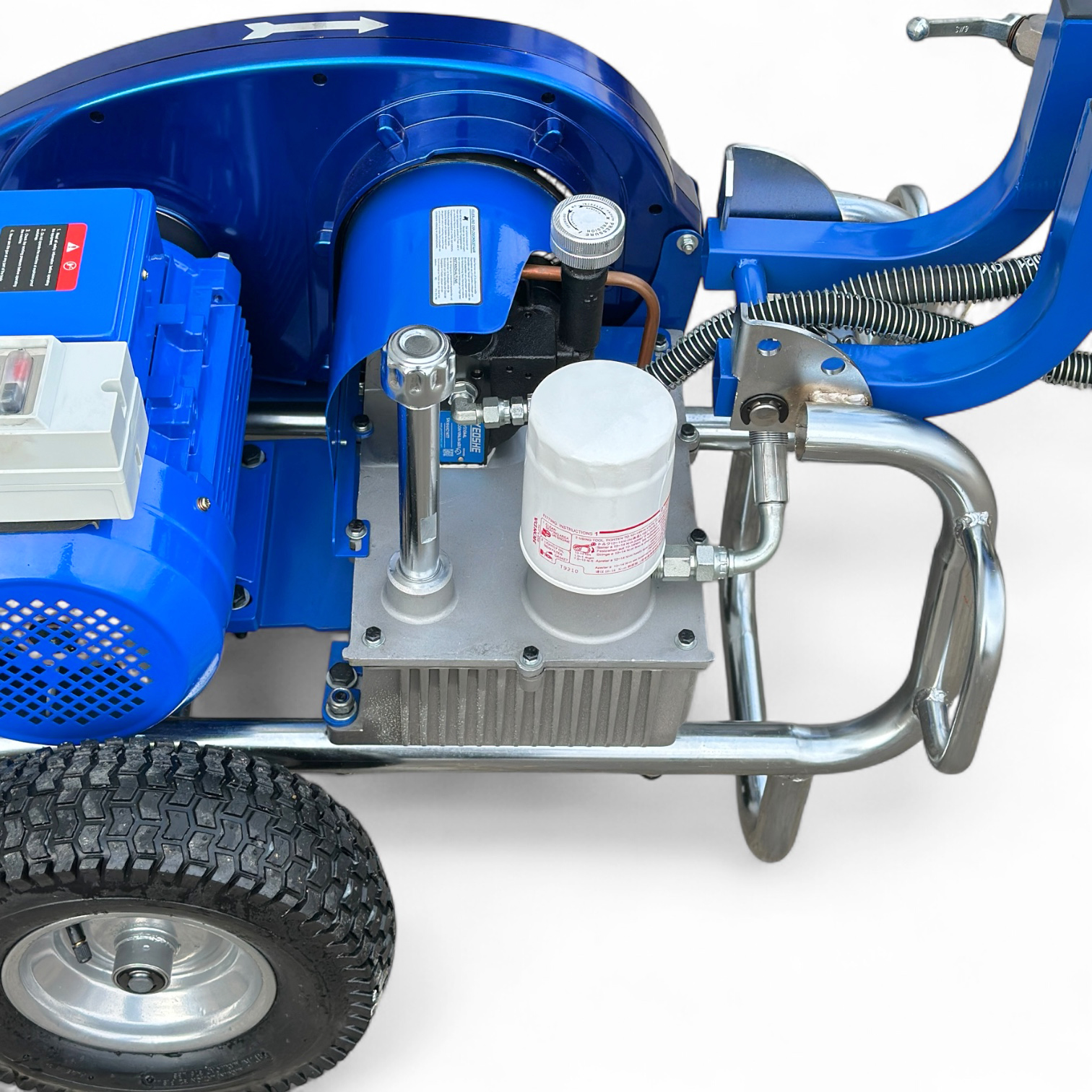 Гидропоршневой насос агрегата приводится в действие гидросистемой, которая, в свою очередь, приводится в действие электрическим двигателем. Гидропоршневая система позволяет работать гораздо эффективнее, чем классические поршневые покрасочные аппараты с электродвигателем.