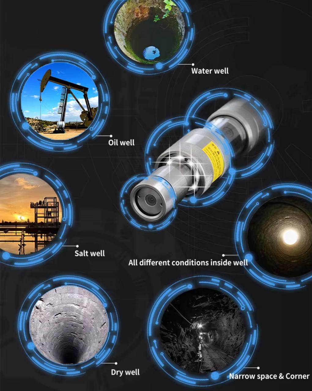 Скважинная камера подходит для инженерной геологии, гидрогеологии, геотехнической инженерии, горной и нефтяной геологии и других отраслей. Ее можно использовать для обнаружения трещин, оползней, посторонних предметов, закупорки в фильтрационной трубе, определения положения жидкого песка, трещин в коренных породах и т.п.