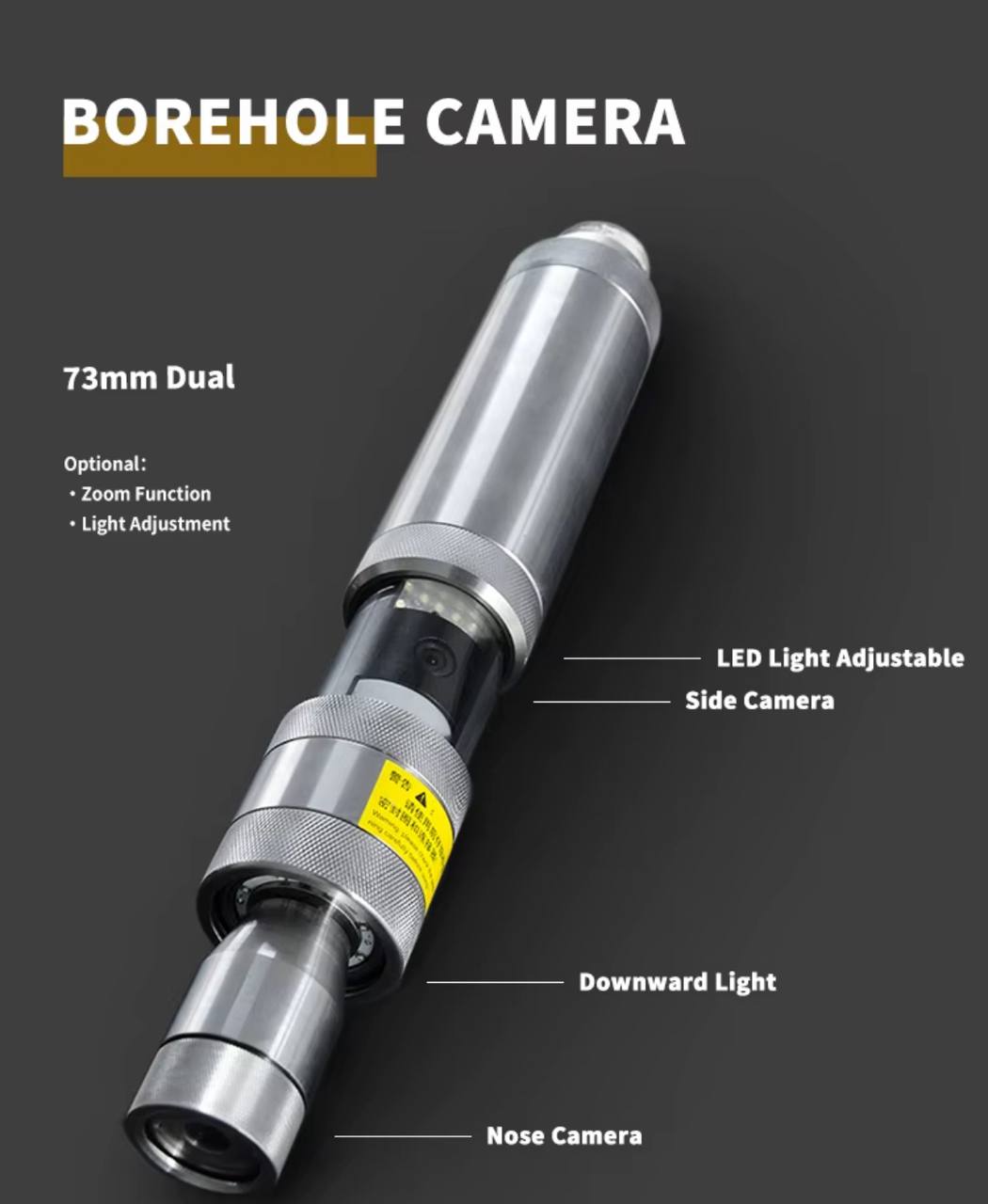 Оснащен двумя камерами – одна снизу, другая со стороны, вращающиеся на 360 градусов; 73 мм двойная камера с функцией высокоточной фокусировки – подводная глубоководная инспекционная камера для скважин.