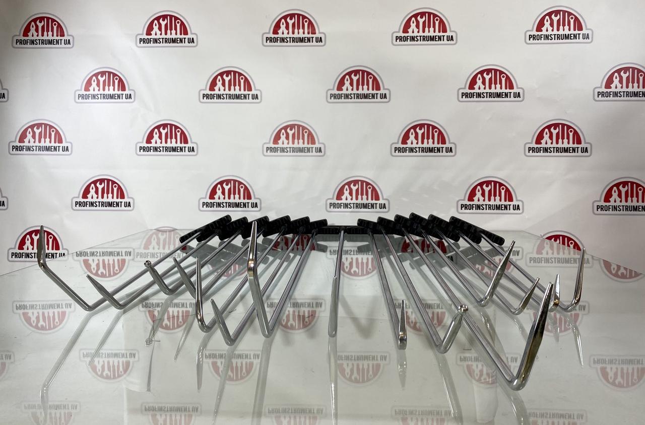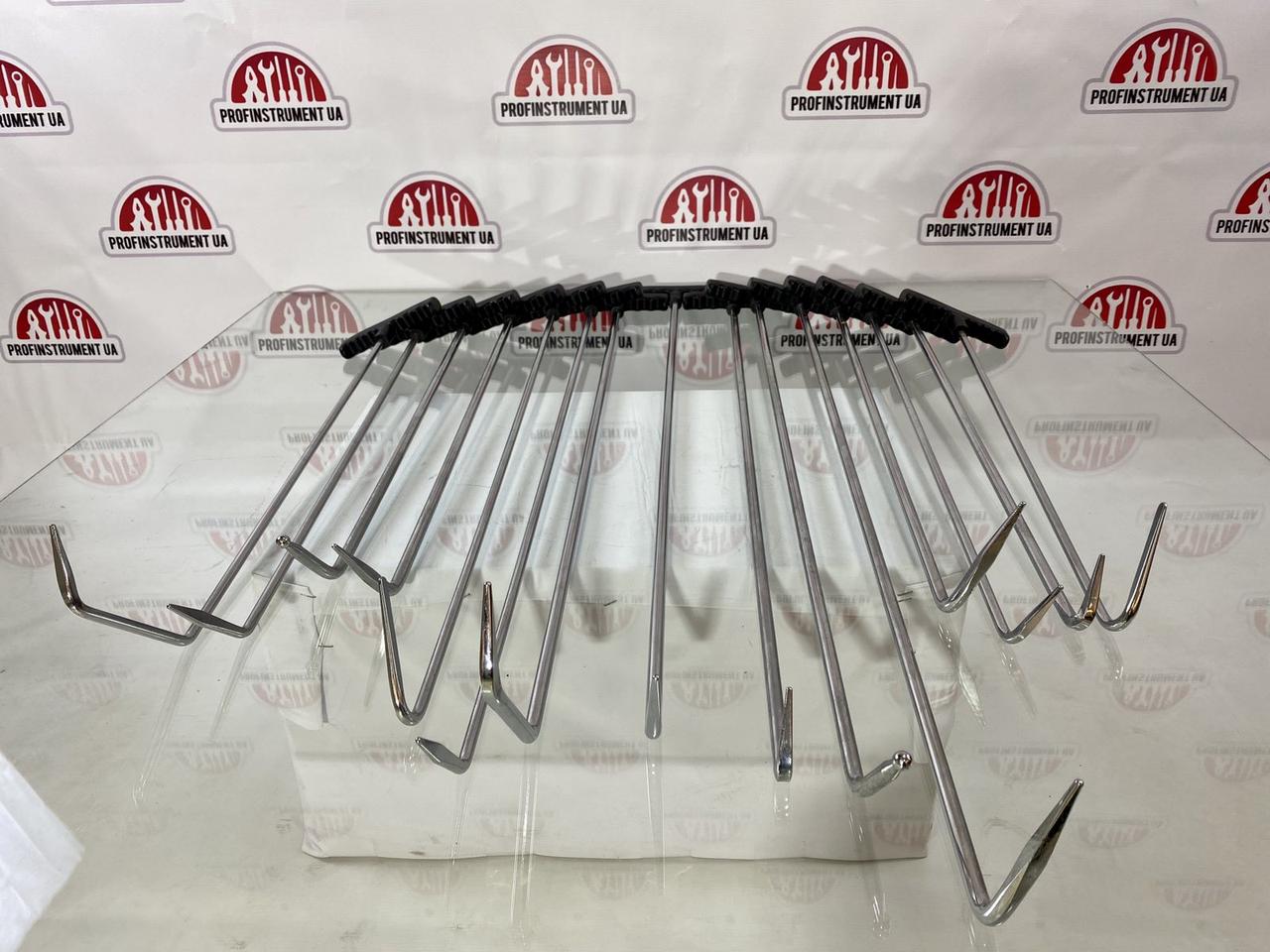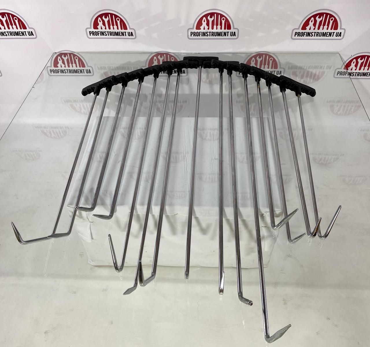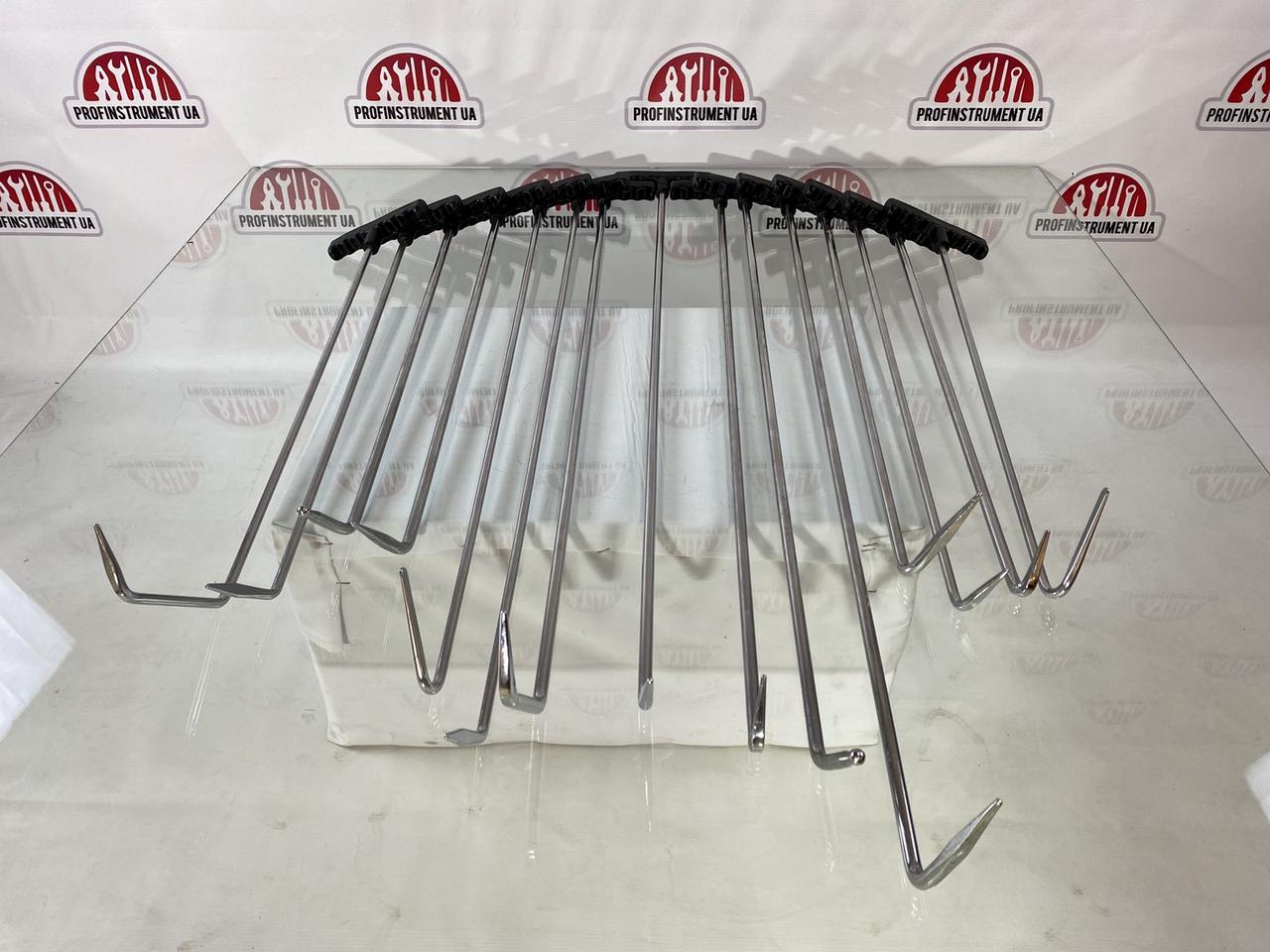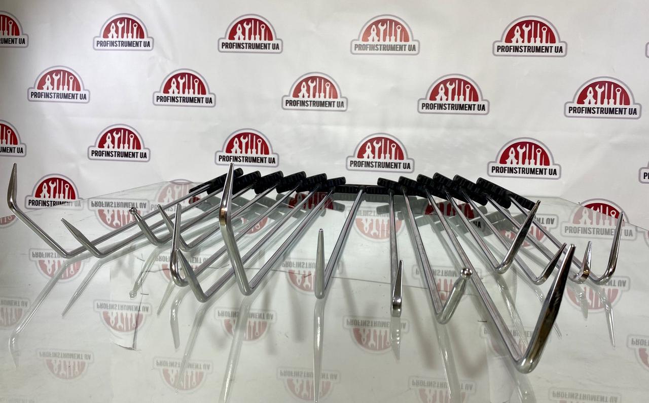 Набор включает различные типы шпилек — прямые, изогнутые, с крючками и с разной формой рабочей части — для максимальной универсальности при работе с различными элементами кузова.