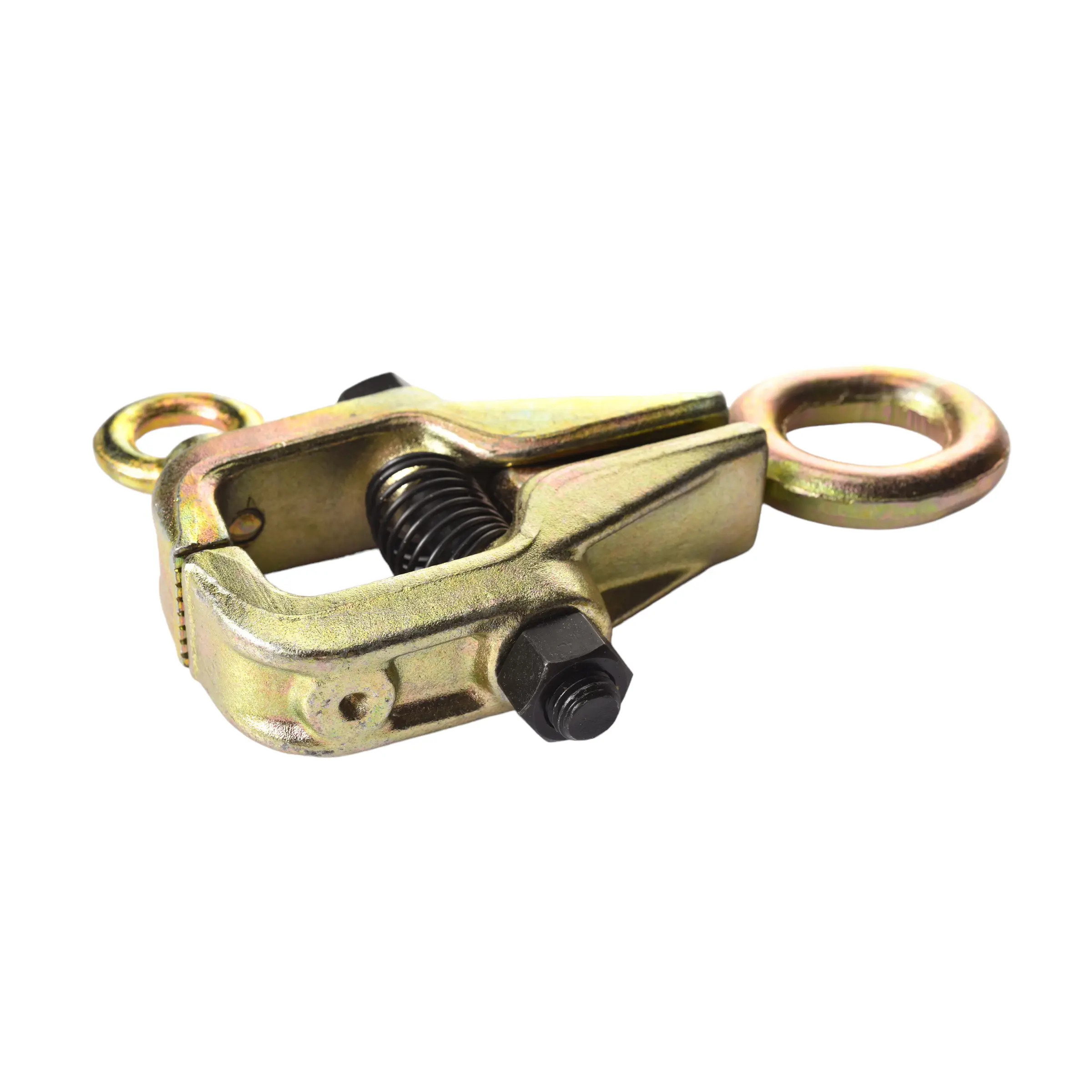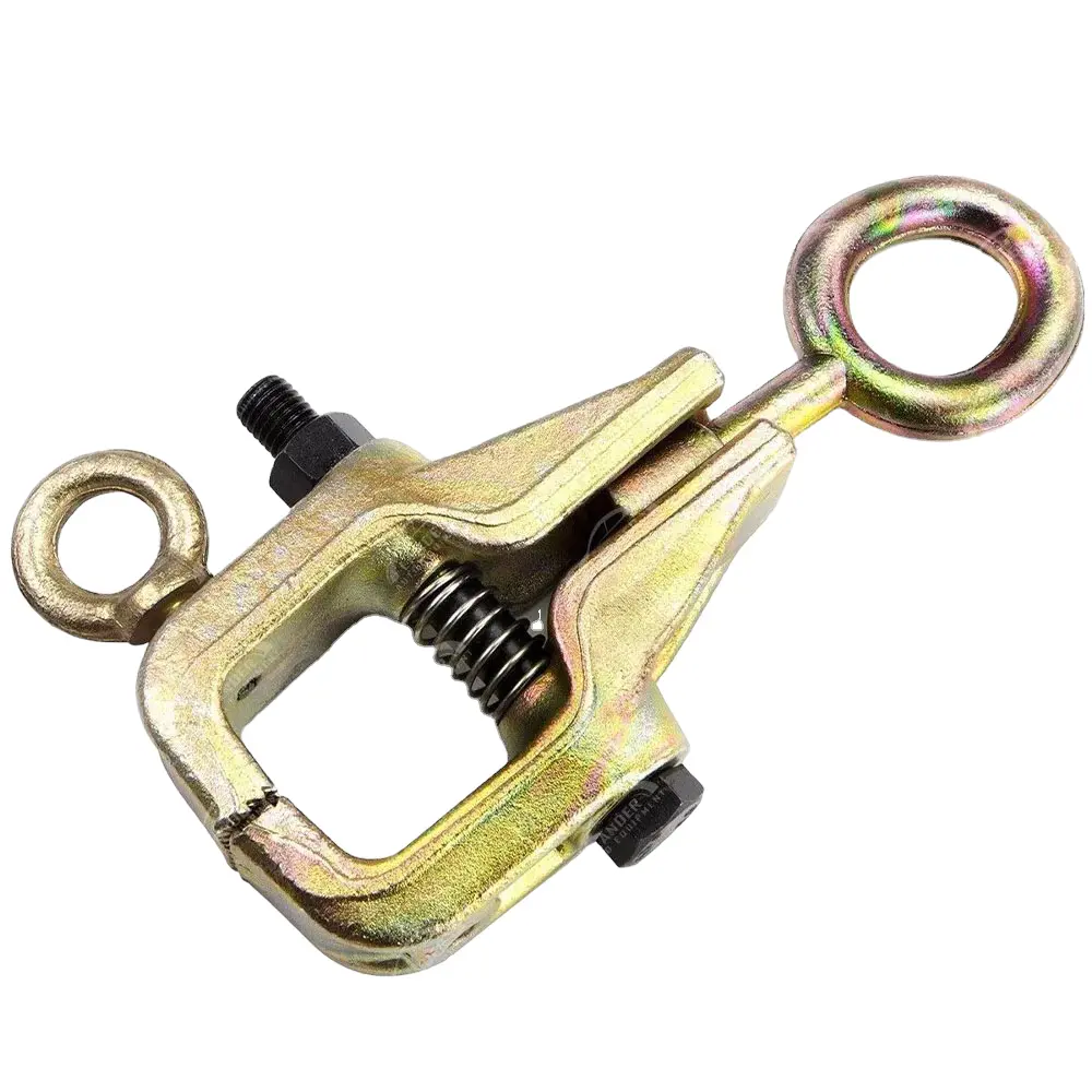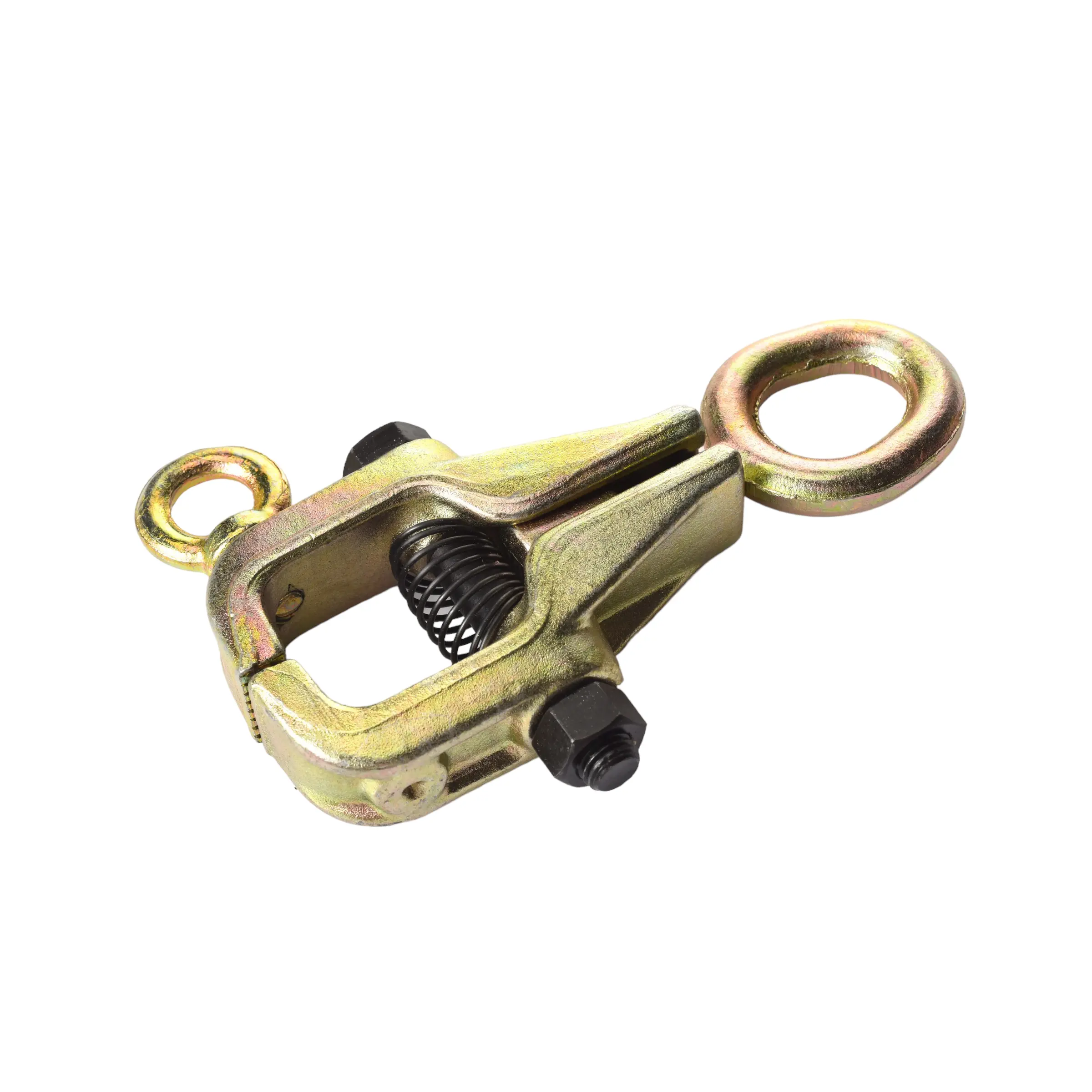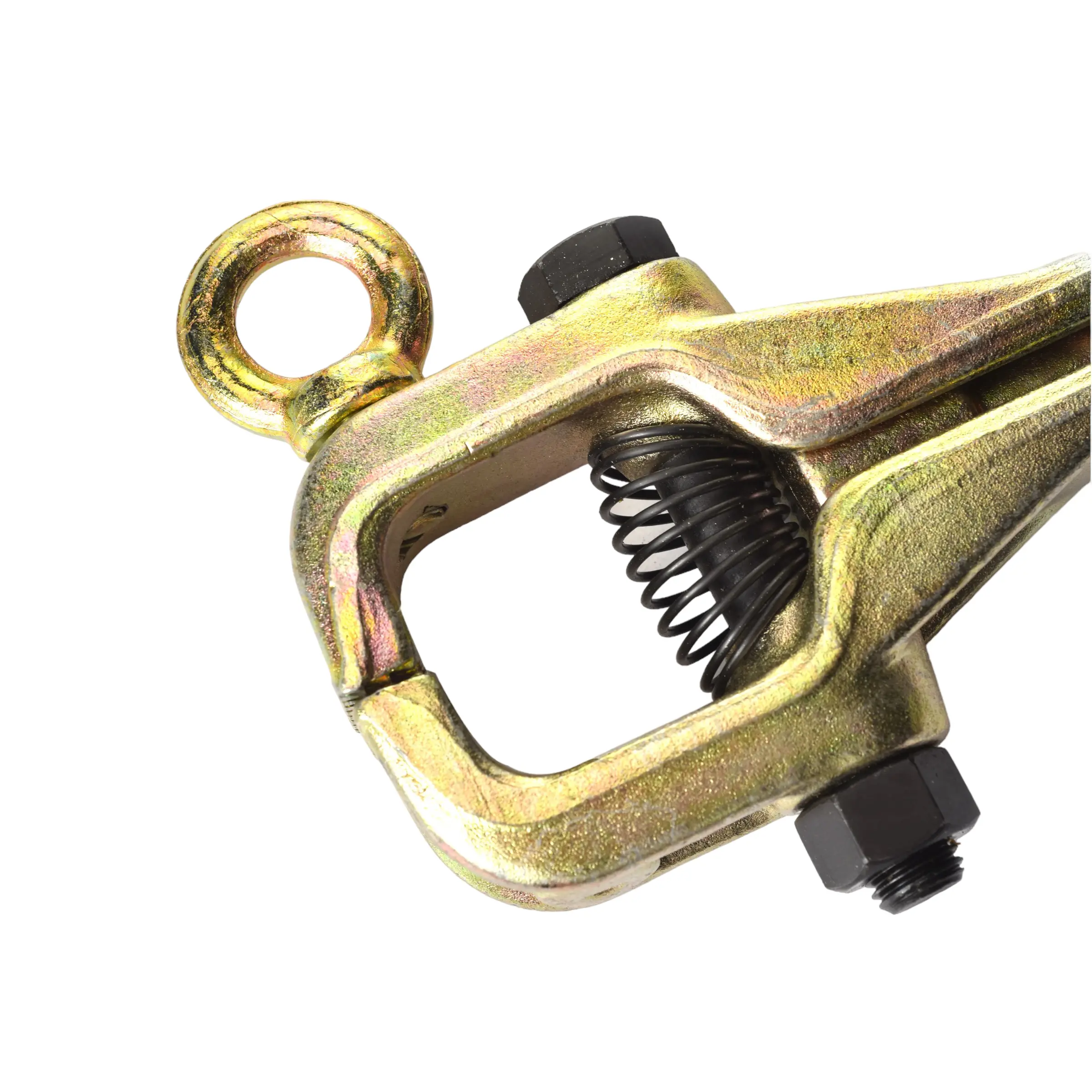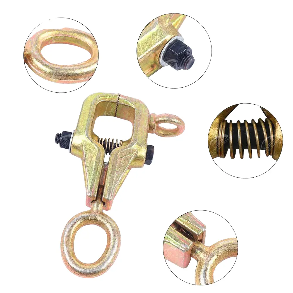 Двухсторонняя металлическая пряжка. Позволяет одновременно натягивать кузов автомобиля в двух направлениях. Зубчатые челюсти повышают уверенность в захвате листового металла. Система самозатяжки использует увеличение прижимной силы челюстей за счет клина, помещенного в ушной шип пряжки.