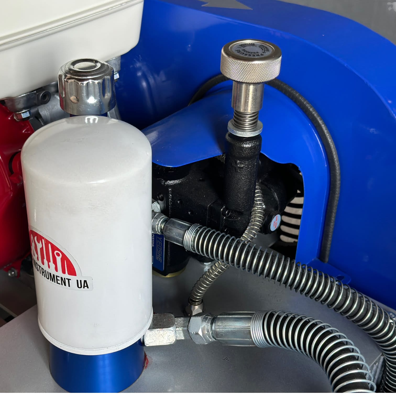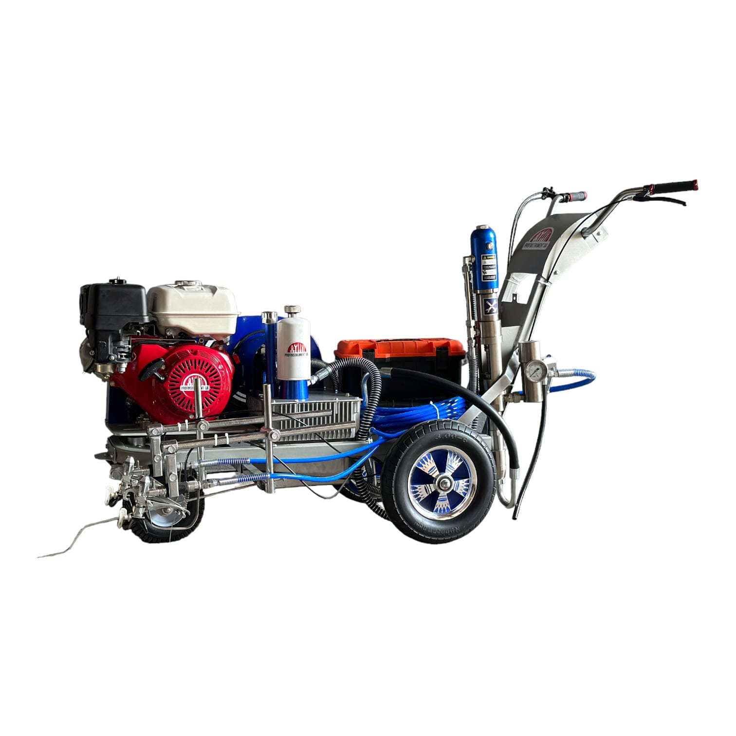 Гидропоршневой насос агрегата приводится в действие гидросистемой, которая в свою очередь приводится в действие бензиновым двигателем. Гидропоршневая система позволяет работать гораздо эффективнее, чем классические разметочные поршневые аппараты.