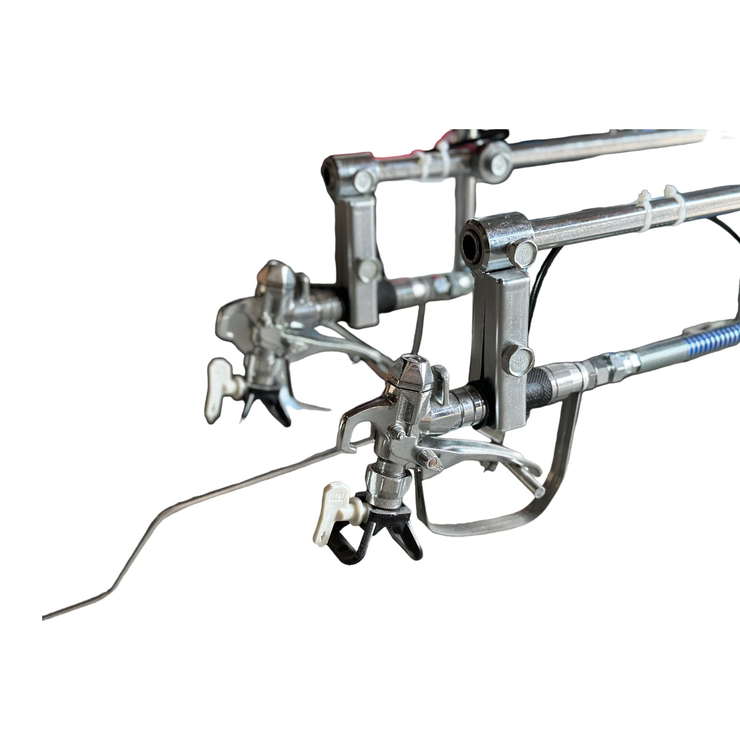 Отсоединив краскораспылители от рамы, можно свободно использовать его как красящий аппарат и красить железобетонные конструкции, мостовые опоры, тоннели и т.д. И все это будет происходить с помощью двух краскопультов.