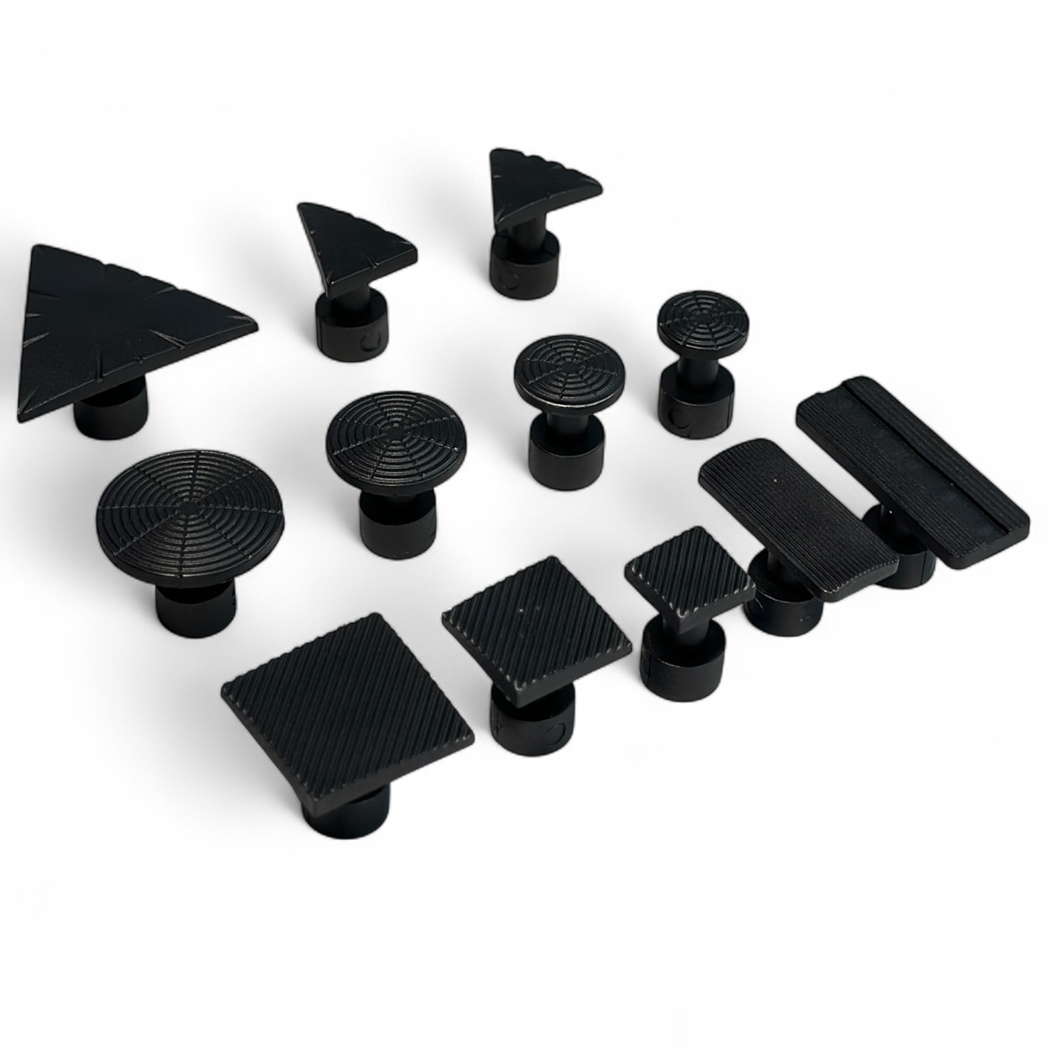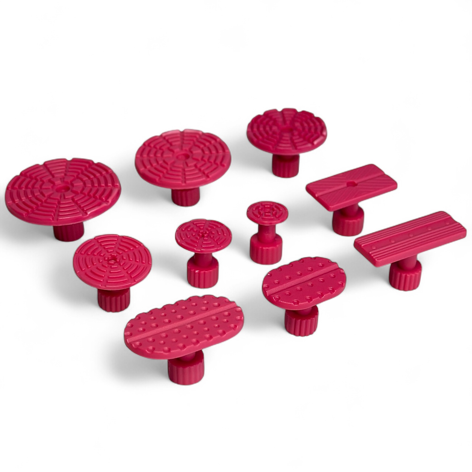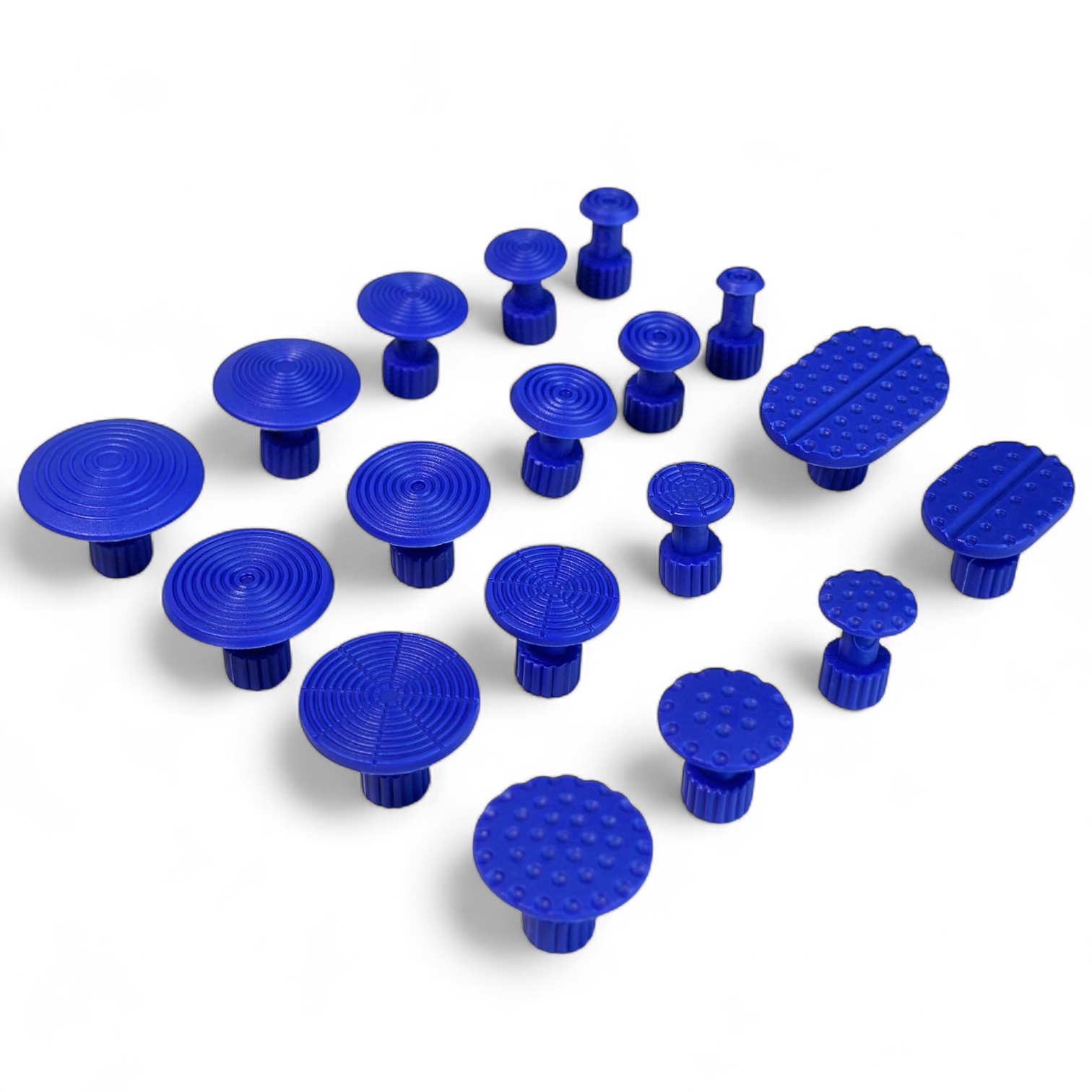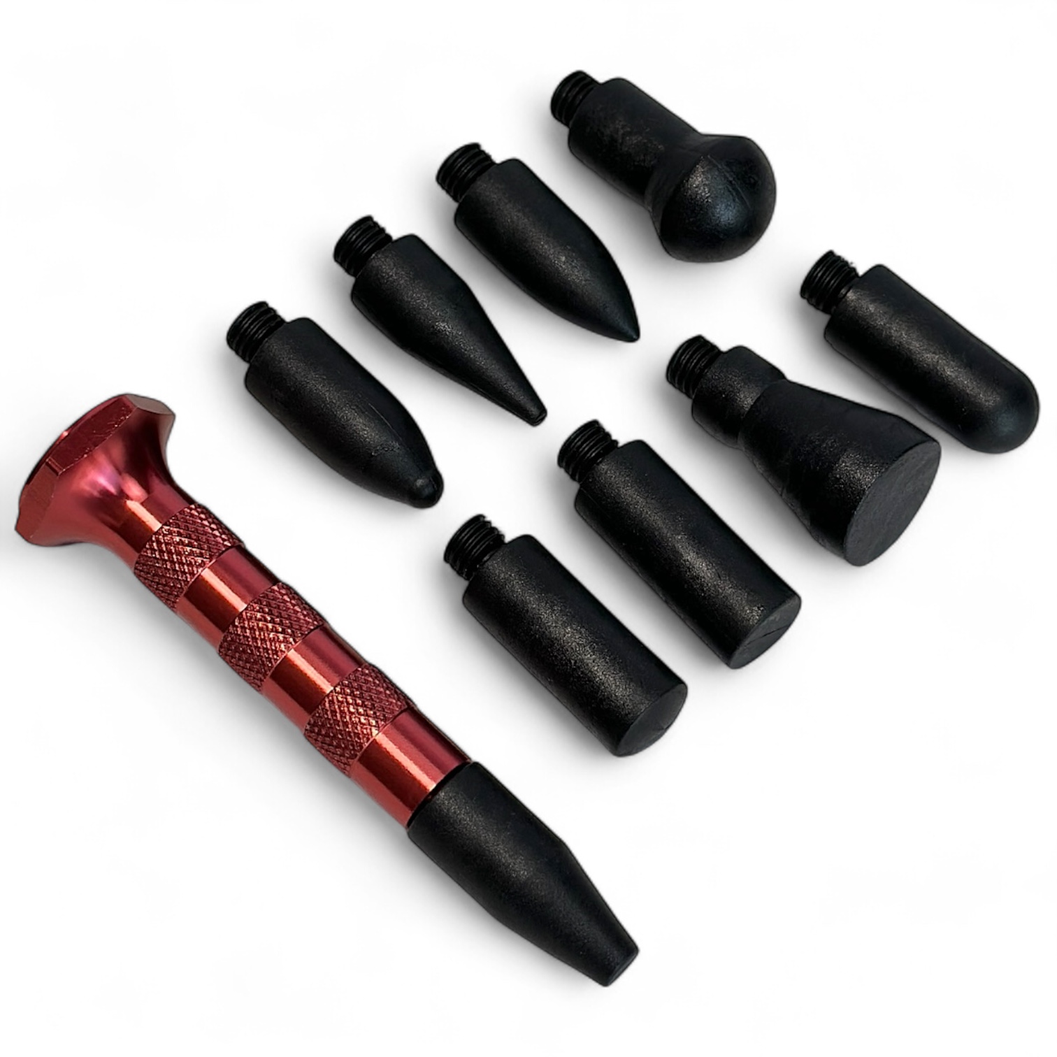В комплекте предусмотрен широкий выбор насадок разной формы, что позволяет обрабатывать как мелкие, так и крупные вмятины. Эргономичный дизайн инструментов гарантирует комфортную работу даже при длительном использовании.