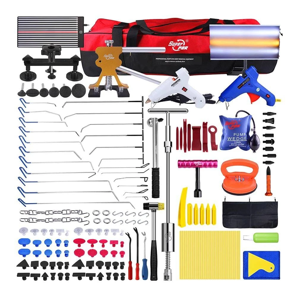 Этот набор содержит все необходимое для поправки вмятин без покраски и других автомобильных ремонтных работ.