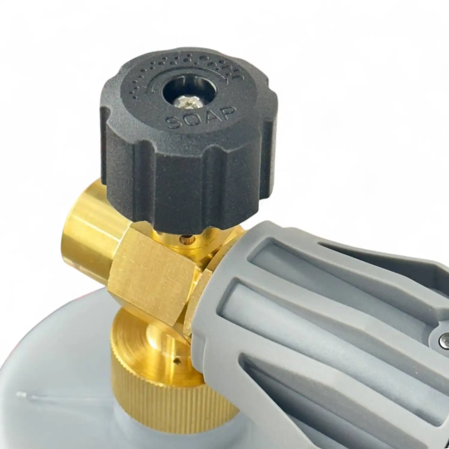 - Регулирующая ручка сверху позволяет регулировать соотношение воды и моющего средства, что позволяет увеличивать или уменьшать толщину распыляемой пены.