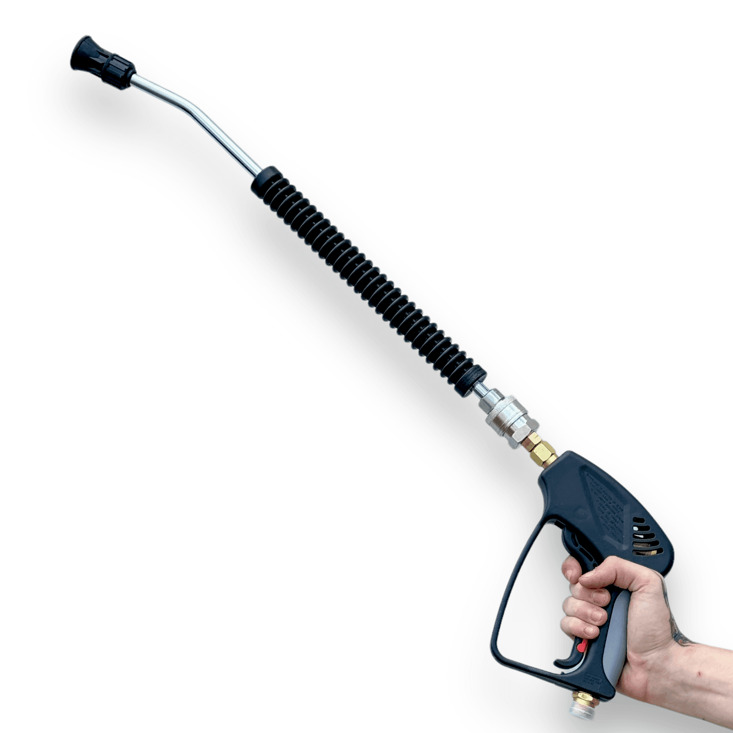 Быстросъемное соединение позволяет быстро снимать и устанавливать пик высокого давления и пенную насадку с моющим средством.