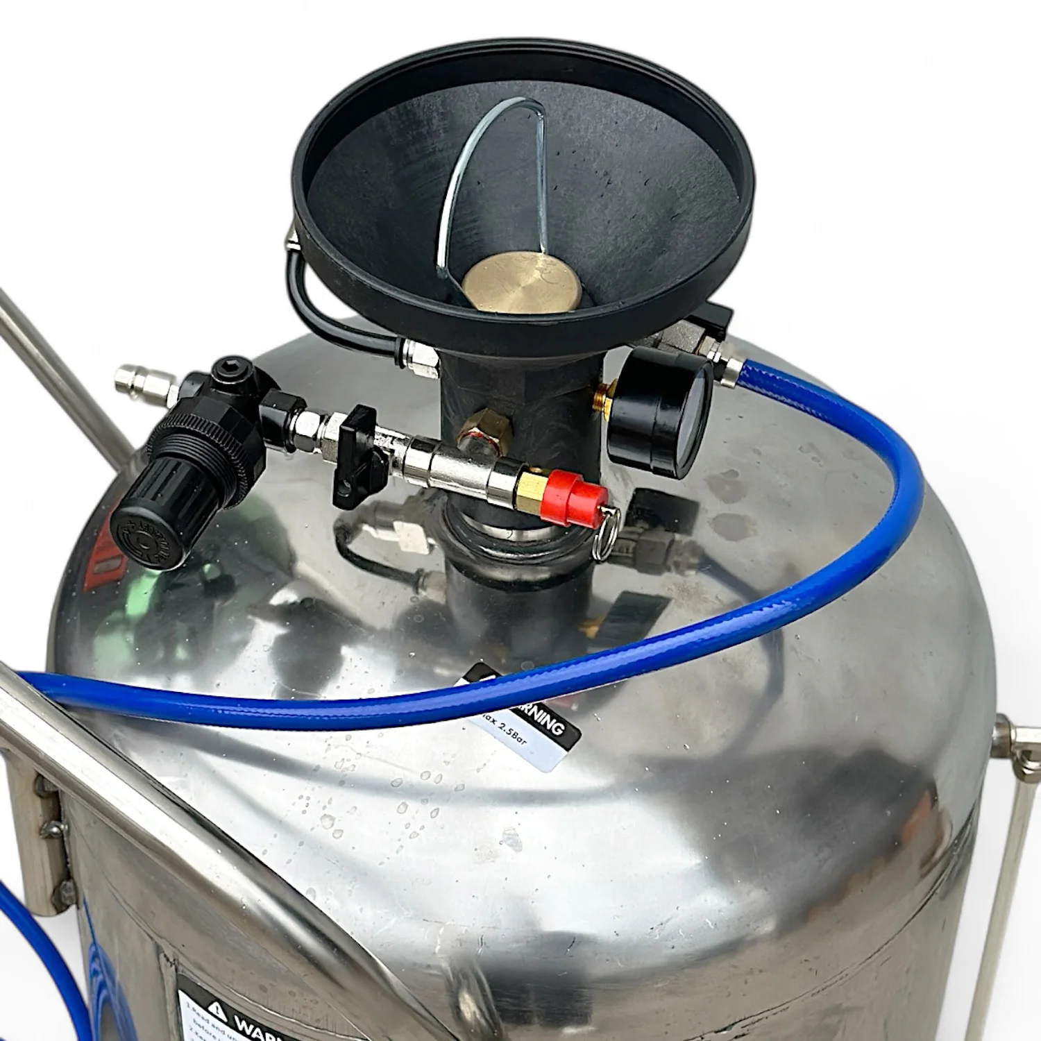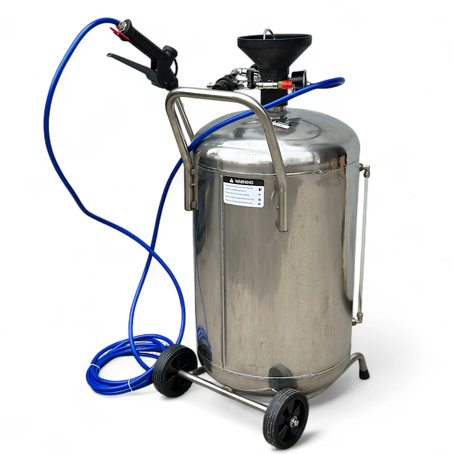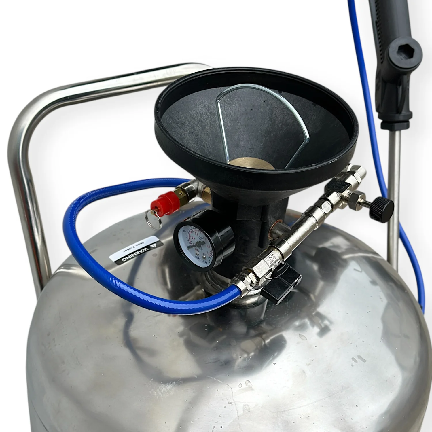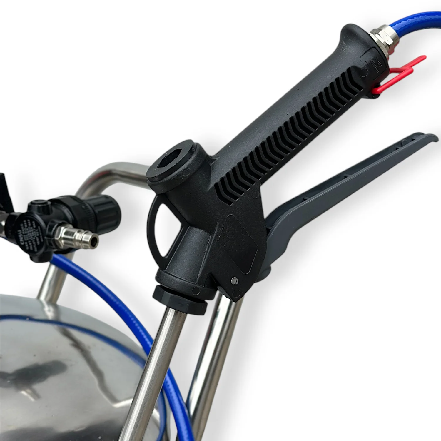 Вода змішується з концентрованим мийним засобом у заданій пропорції. Стиснене повітря (6–8 бар) подається в бак, де активна речовина перетворюється на щільну піну. Завдяки регуляторам оператор може контролювати густоту піни та потік повітря. Манометр показує поточний тиск, а запобіжний клапан забезпечує безпечну експлуатацію.