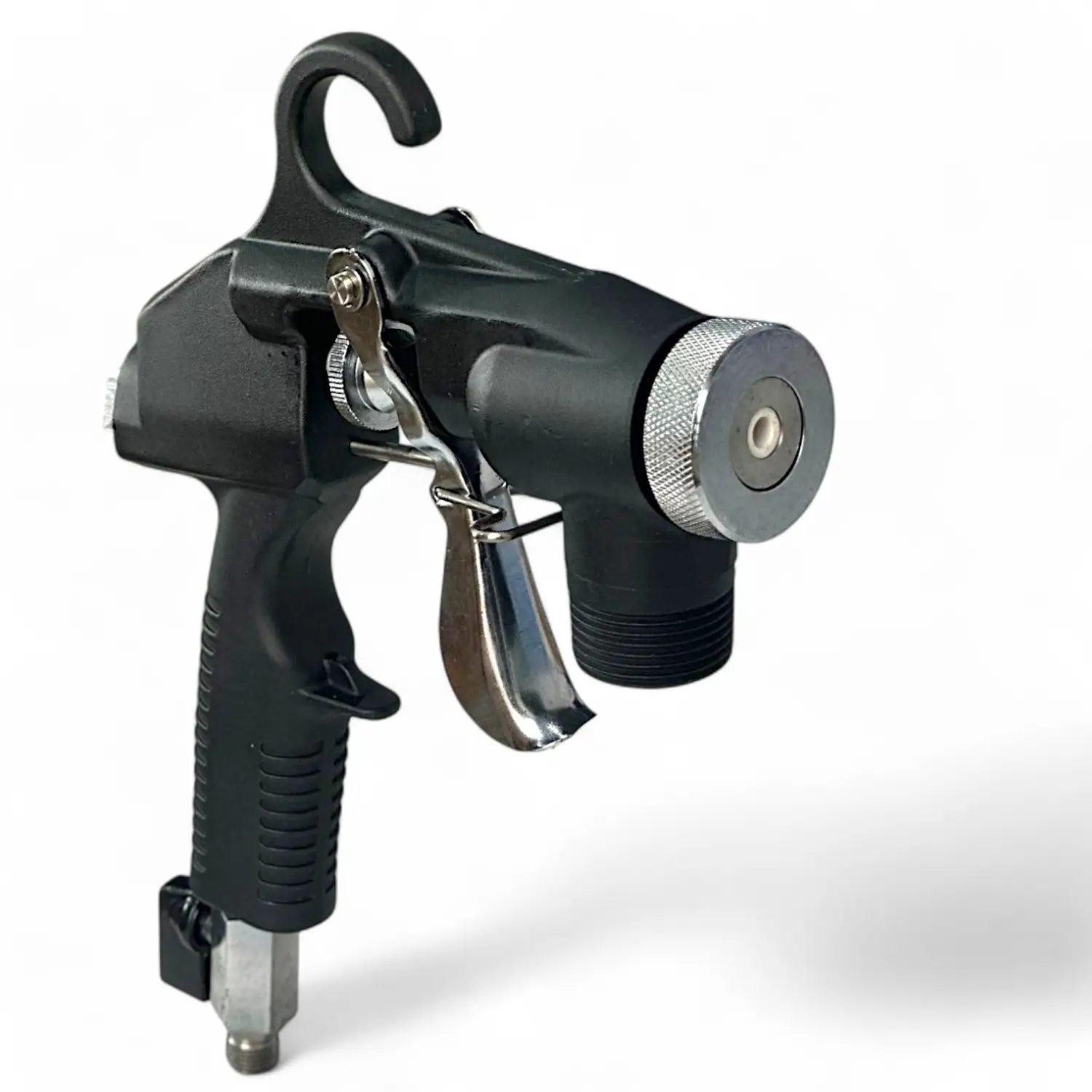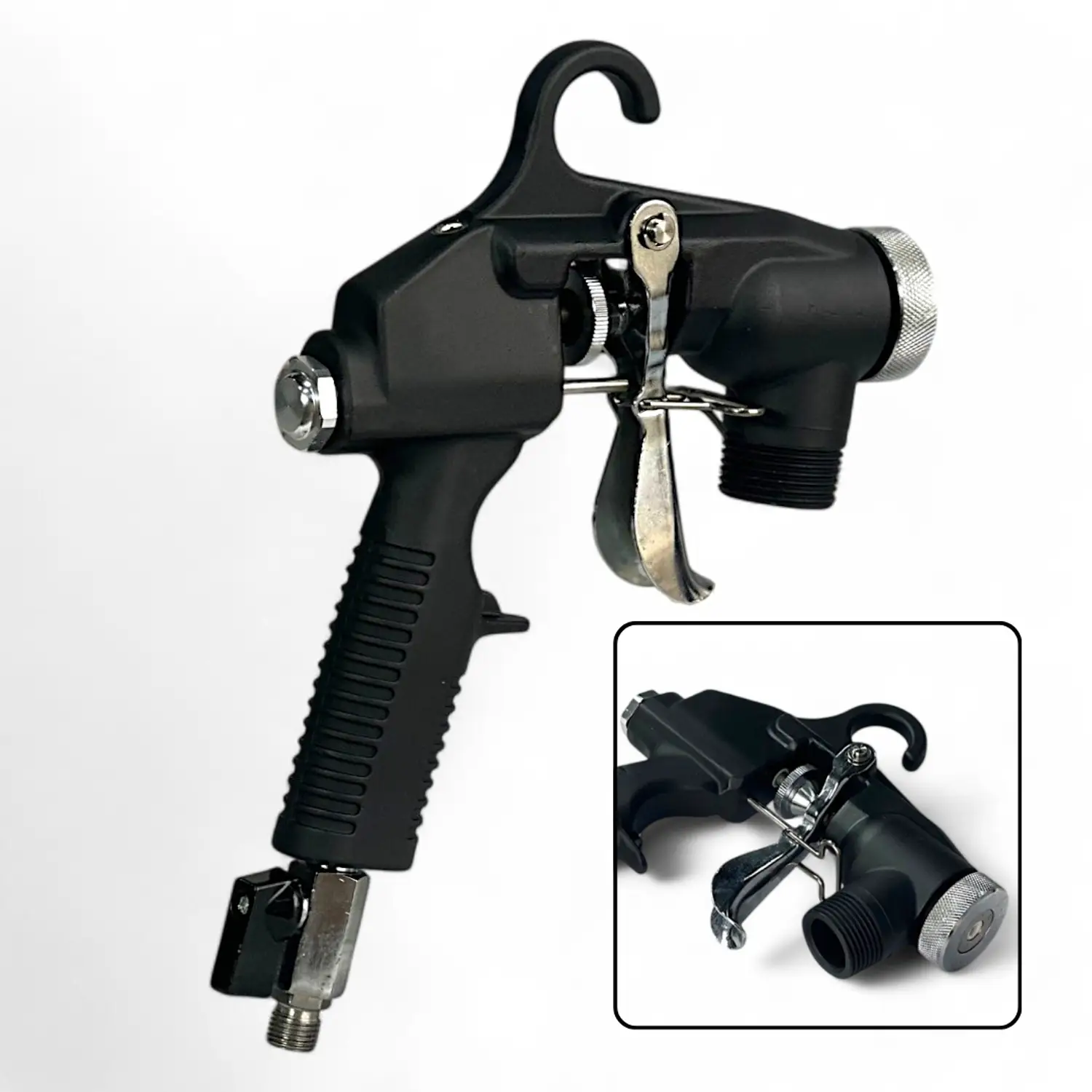 На выходе из сопла шпатлевка, гидроизоляционный или декоративный материал подхватывается, разбивается на мельчайшие частицы сжатым воздухом и наносится на обрабатываемую поверхность, обеспечивая равномерное и эффективное распределение.