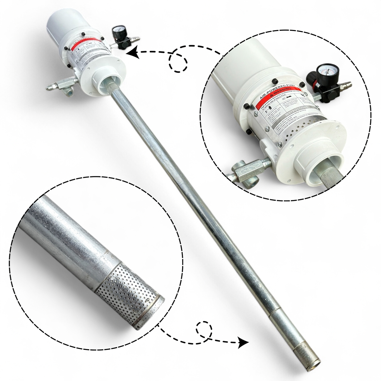 Конструкция двойного действия обеспечивает плавный поток смазки без контакта металлических поверхностей, что продлевает срок службы насоса. Прочная сетка для всасывания выдерживает экстремальные нагрузки.