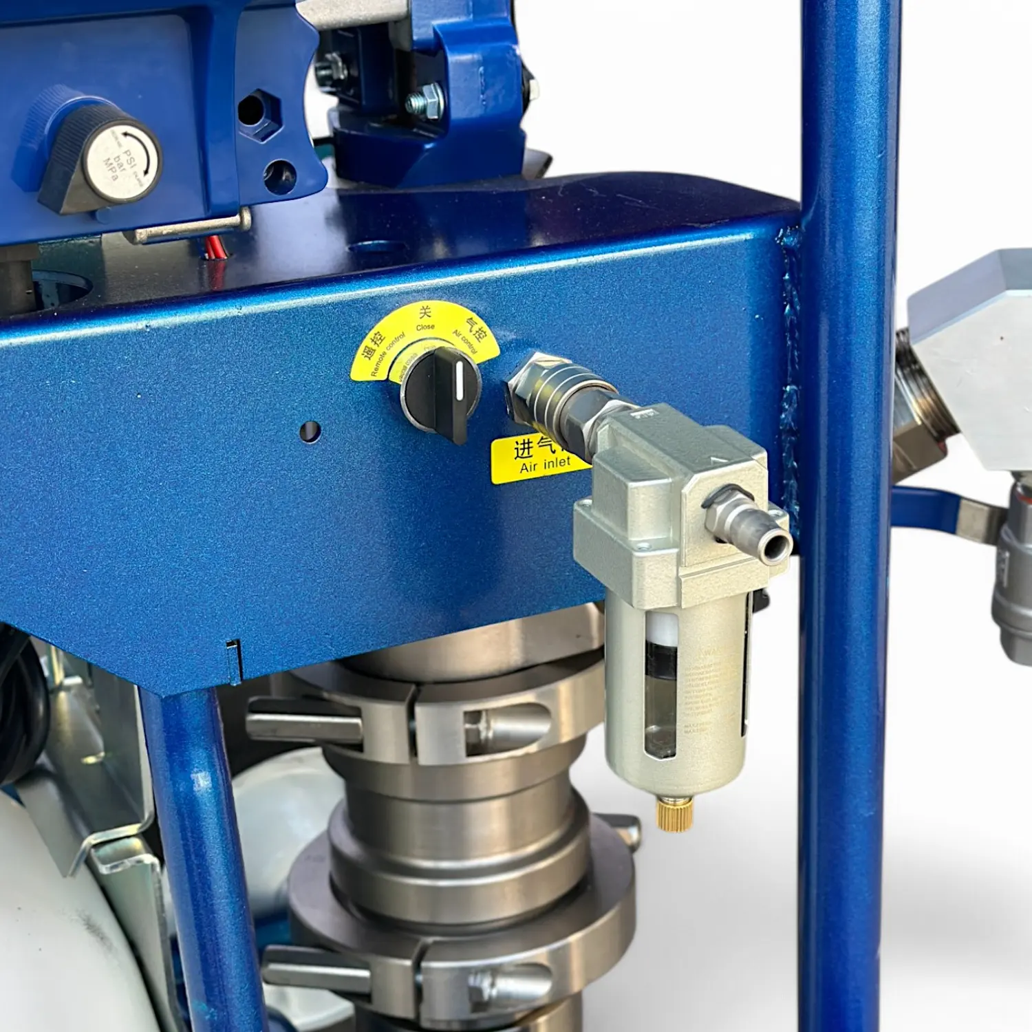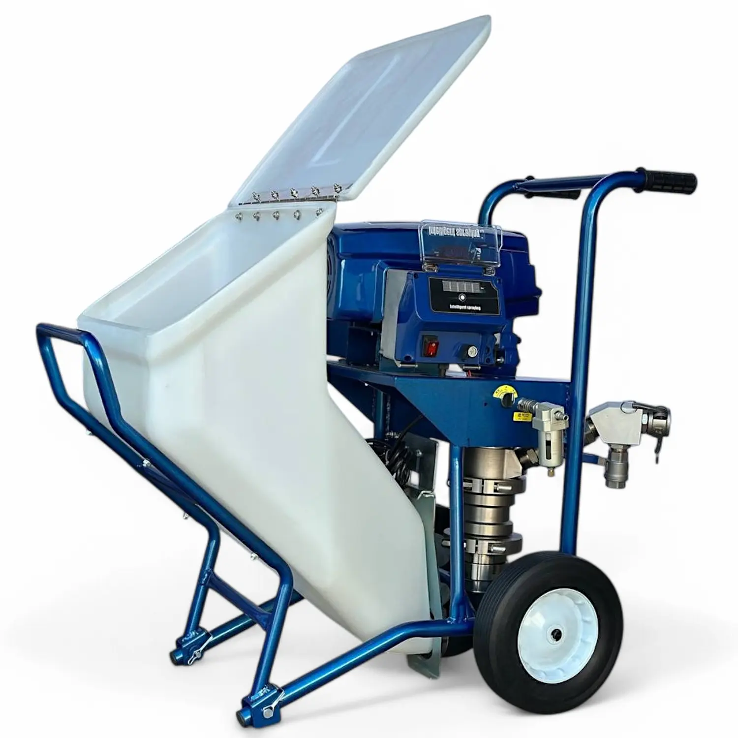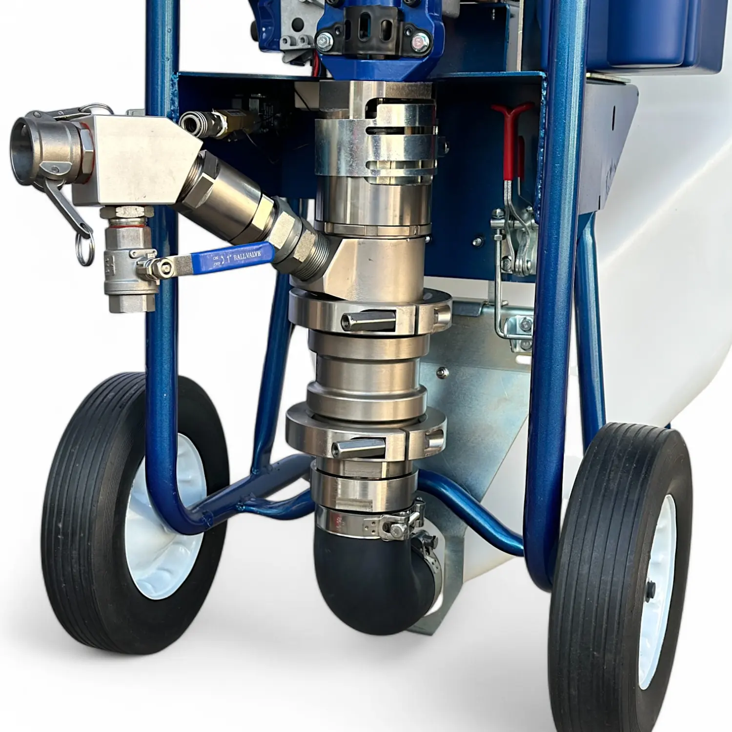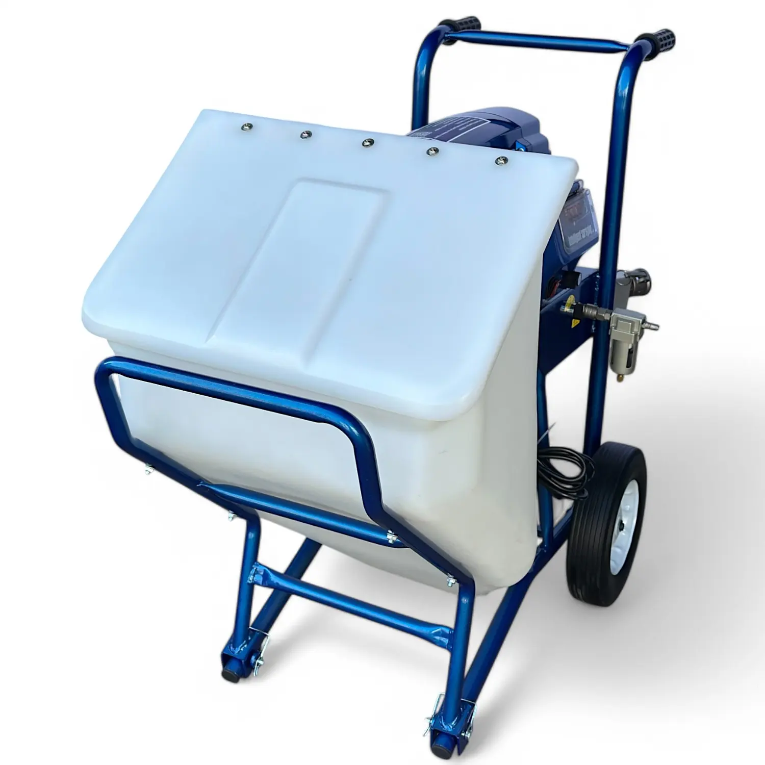 - Высокая производительность: Насос способен работать с большим количеством материала, обеспечивая распыление до 100 мешков в день и создавая высокое давление до 41 бар (600 psi). Это позволяет эффективно работать даже на расстоянии до 46 метров (150 футов) от агрегата, что особенно важно для больших объектов.