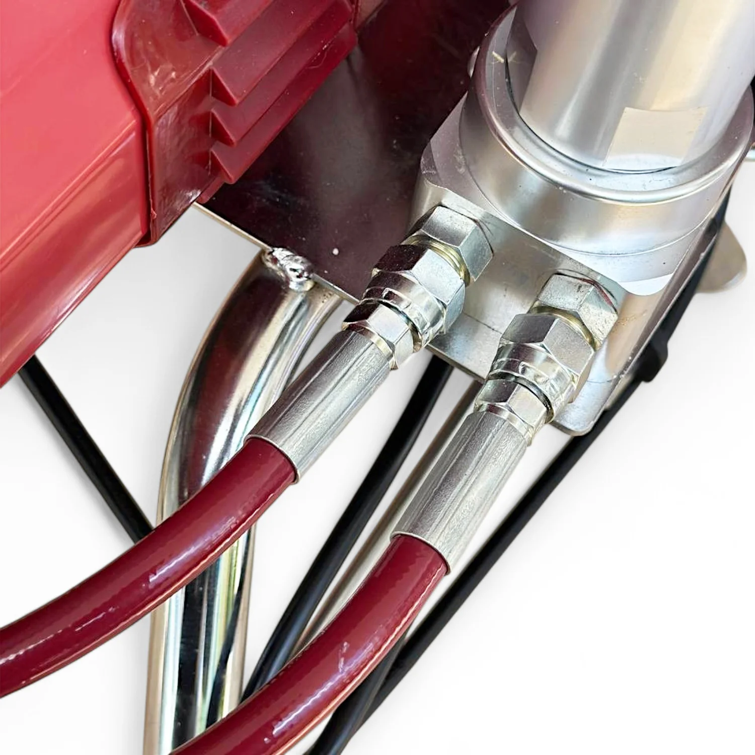 - Краска под давлением электрического поршневого насоса подается через шланг к краскопульту, что обеспечивает равномерное нанесение краски.