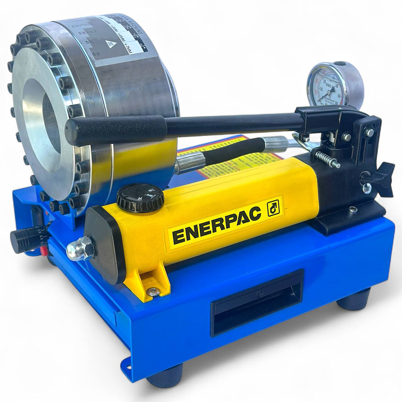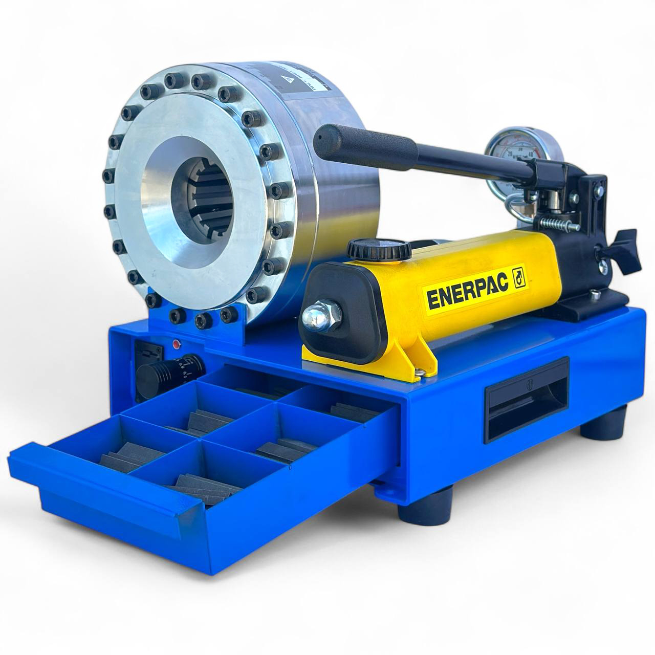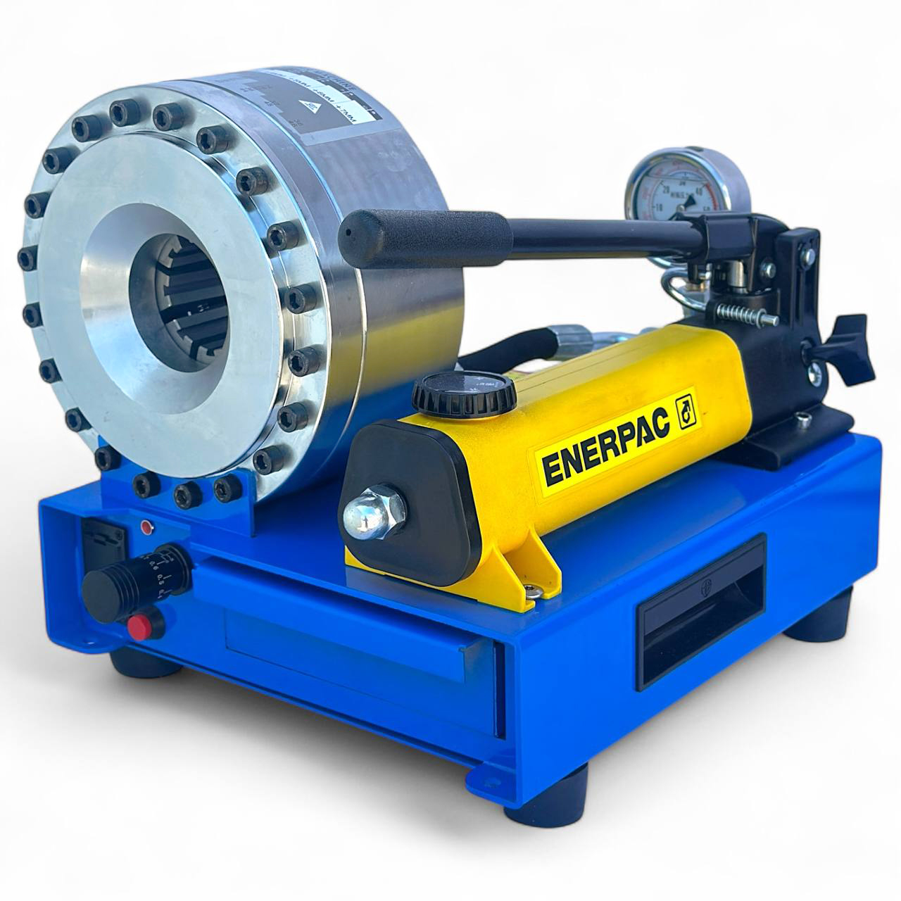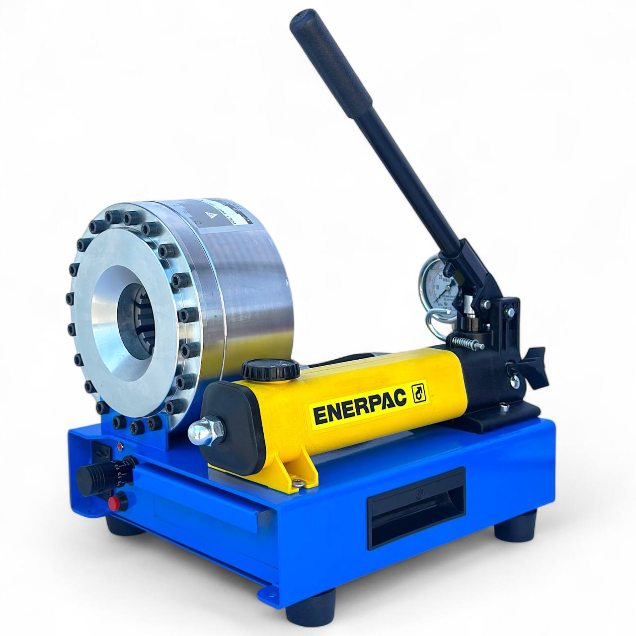 - Гидравлический обжимной станок ENERPAC — предназначен для обжима гидравлических шлангов высокого давления с использованием сменных кулачков разного диаметра.