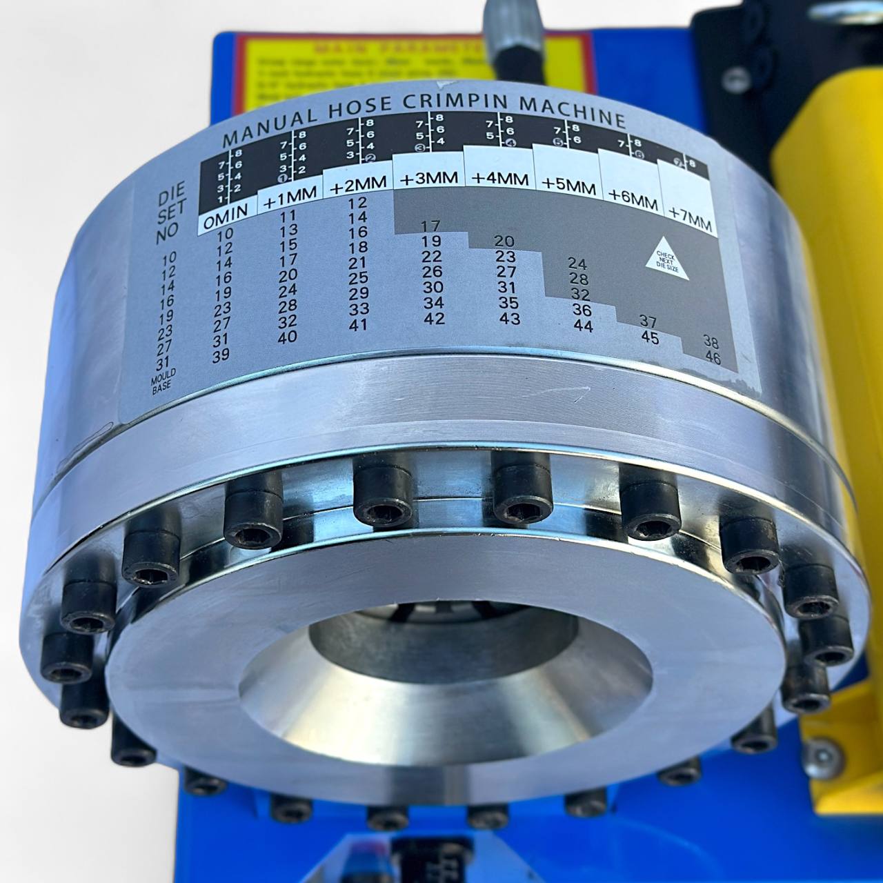 В комплект входит 8 наборов кулачков разного размера. Ниже приведена таблица обжима рукавов высокого давления. Также в станке встроен индикатор для точной выставки размера: