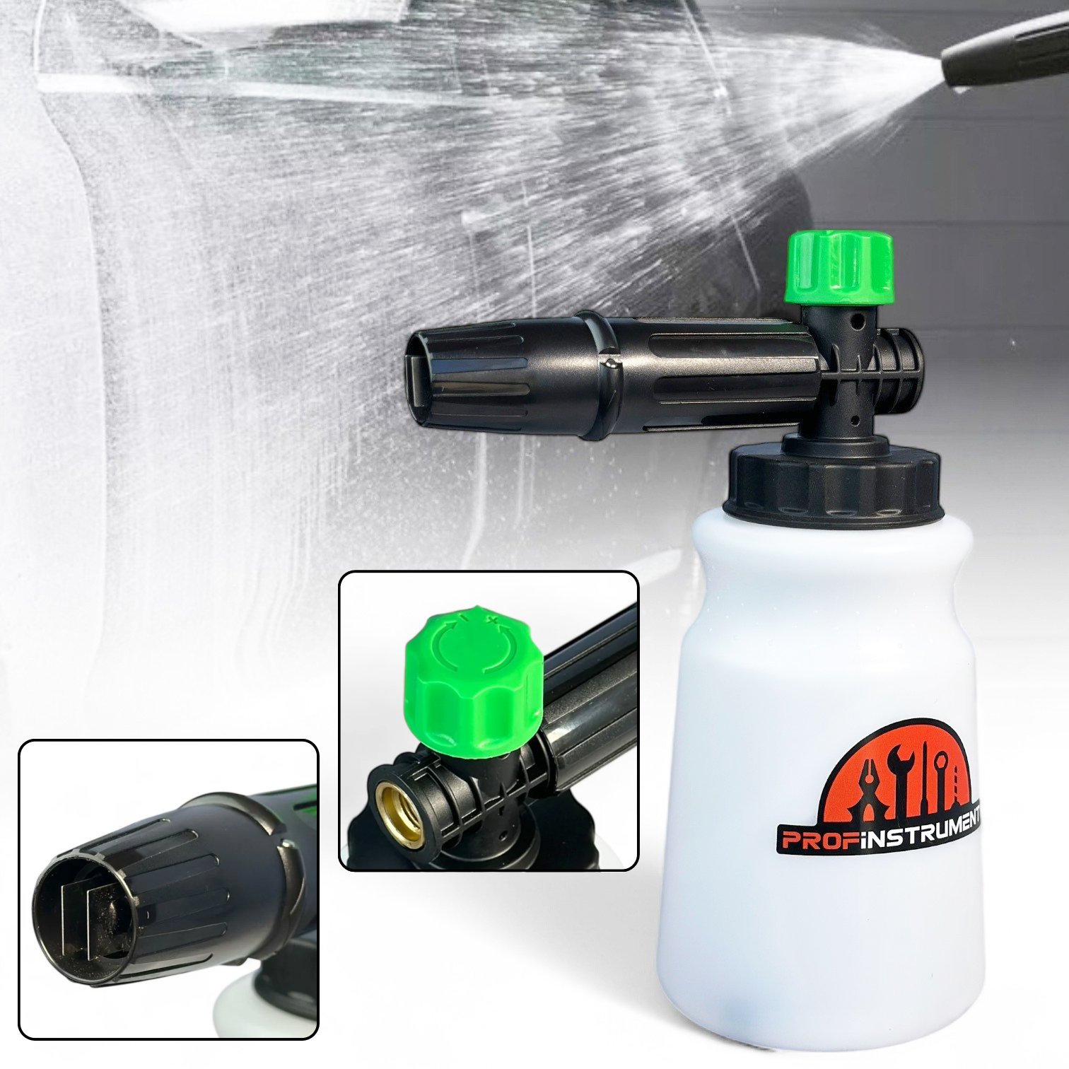 Пенная насадка Profinstrument Q4 предназначена для тех, кто ценит идеальную чистоту и эффективность мойки. Она смешивает моющее средство с водой под высоким давлением и образует плотную насыщенную пену, которая прекрасно прилипает к любой поверхности: автомобиля, мотоцикла, плитки, асфальта, крыши или садового инвентаря.