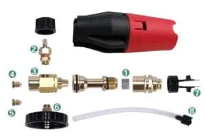 - Материал: цельный латунный и металлический корпус, сопло из нержавеющей стали, нейлоновая крышка и бутылка HDPE.