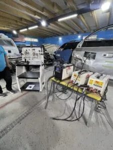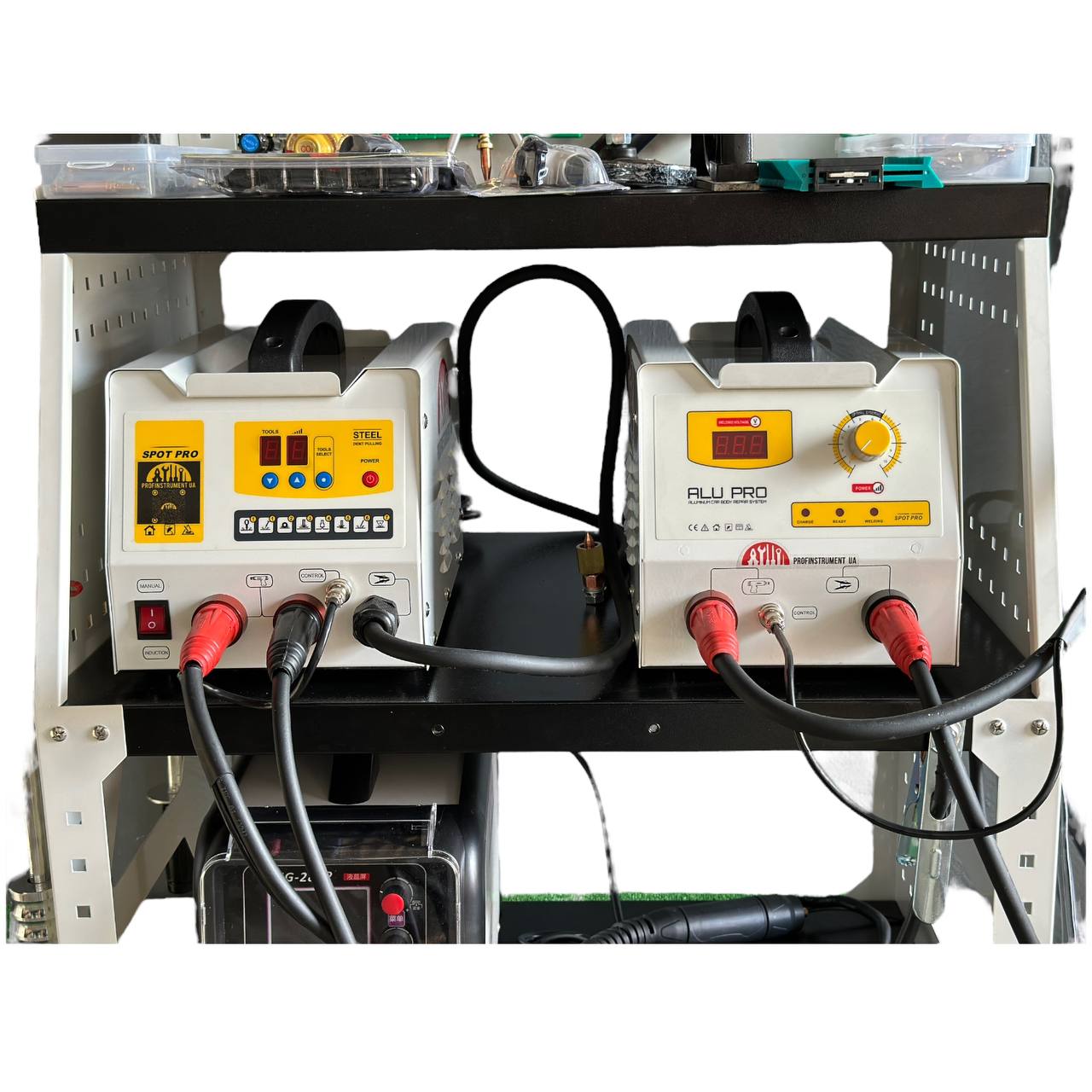 Точечная сварка алюминия и металла споттером Profinstrument RKA 3000 – 3 сварочные спотера на одной тележке, очень удобно для работы с алюминиевыми или стальными и омедненными деталями и последующего вытягивания металлических поверхностей. Спотер незаменим на СТО и в мастерских по ремонту автомобилей.