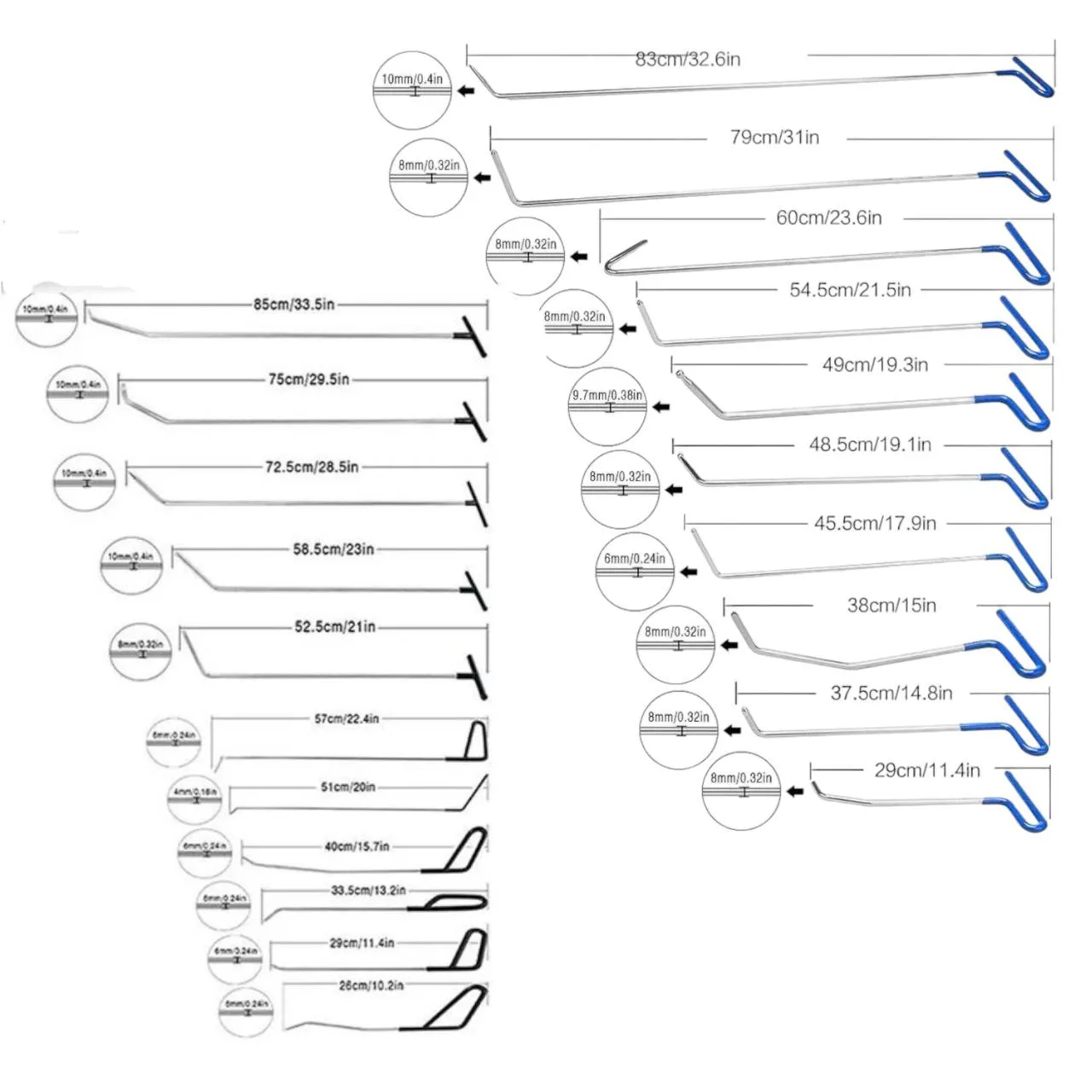 Набор крючков для рихтовки автомобиля состоит из 21 штук разной формы и размера, предназначенных для удаления вмятин и коррекции повреждений на кузове автомобиля. Каждый крючок изготовлен из качественной и прочной стали, что обеспечивает долговечность и надежность инструмента.