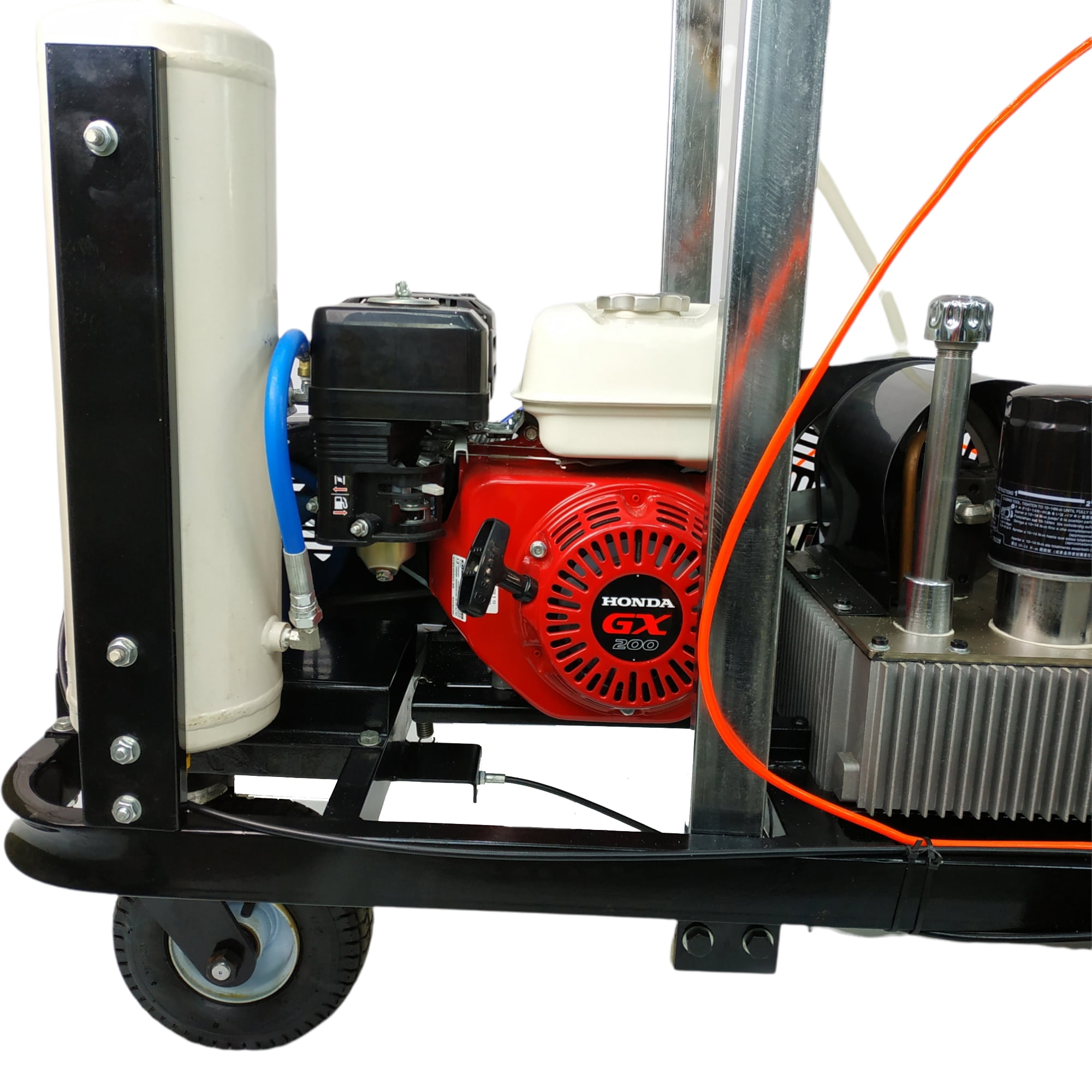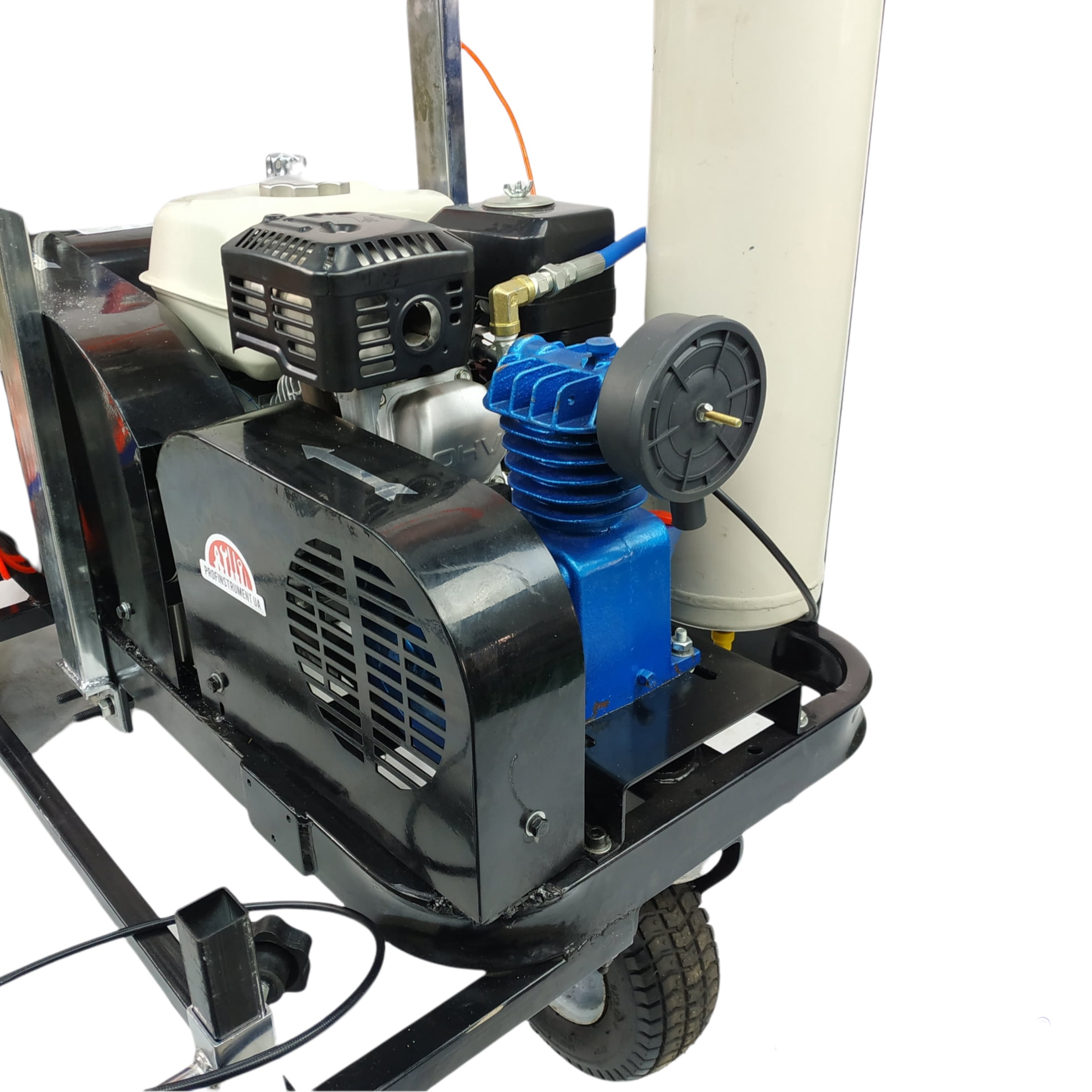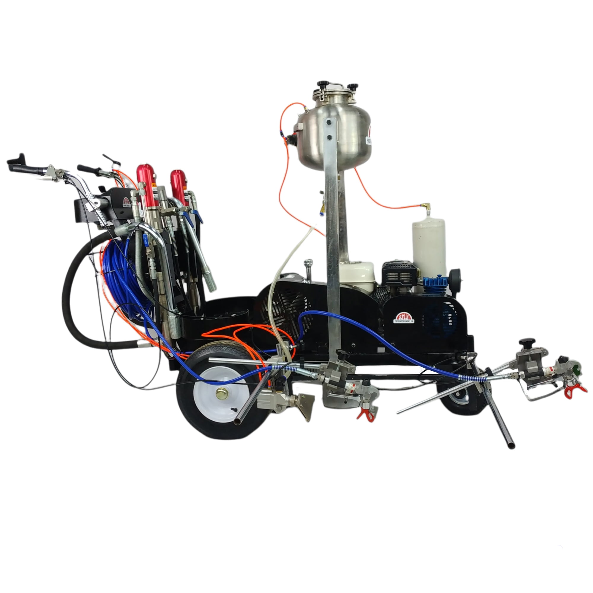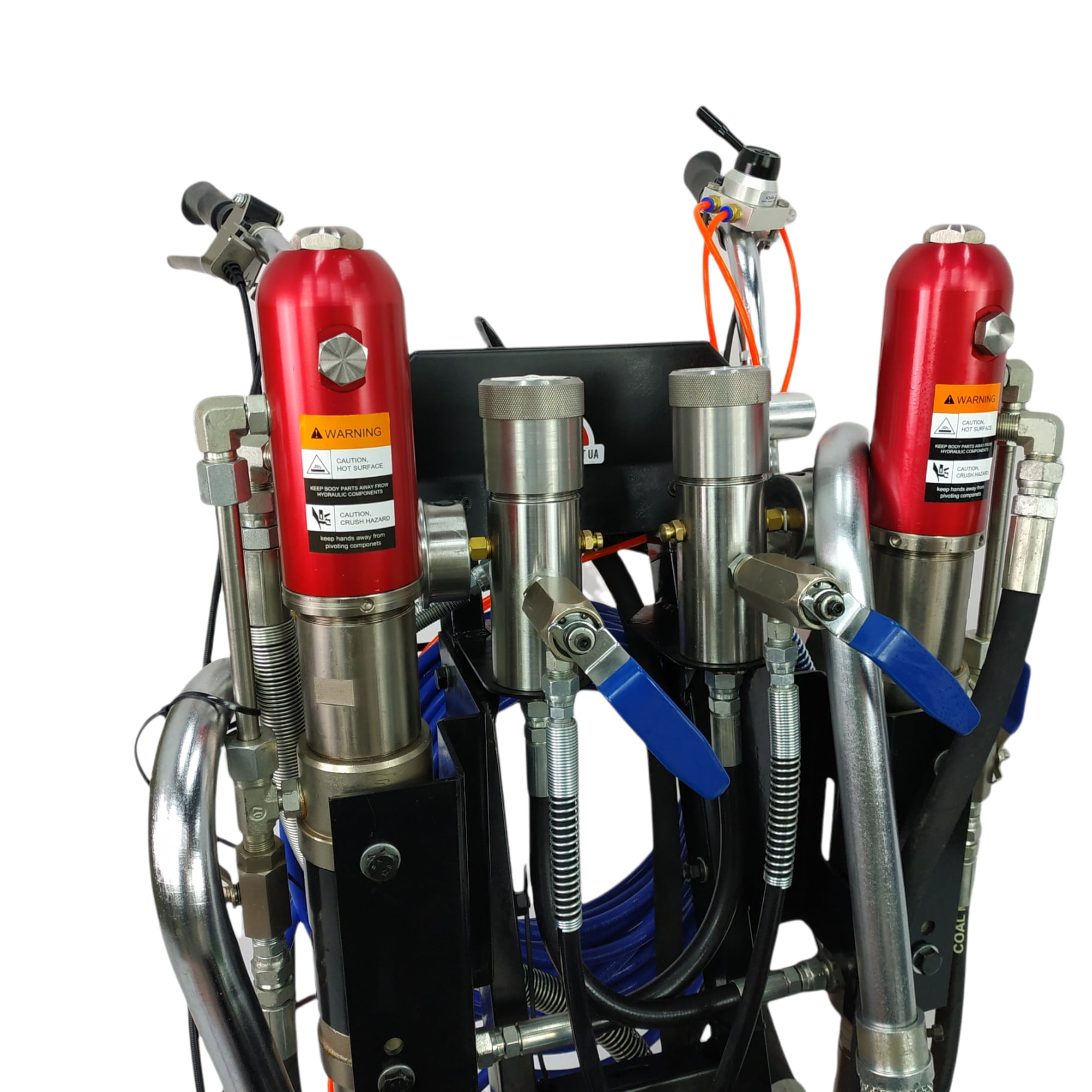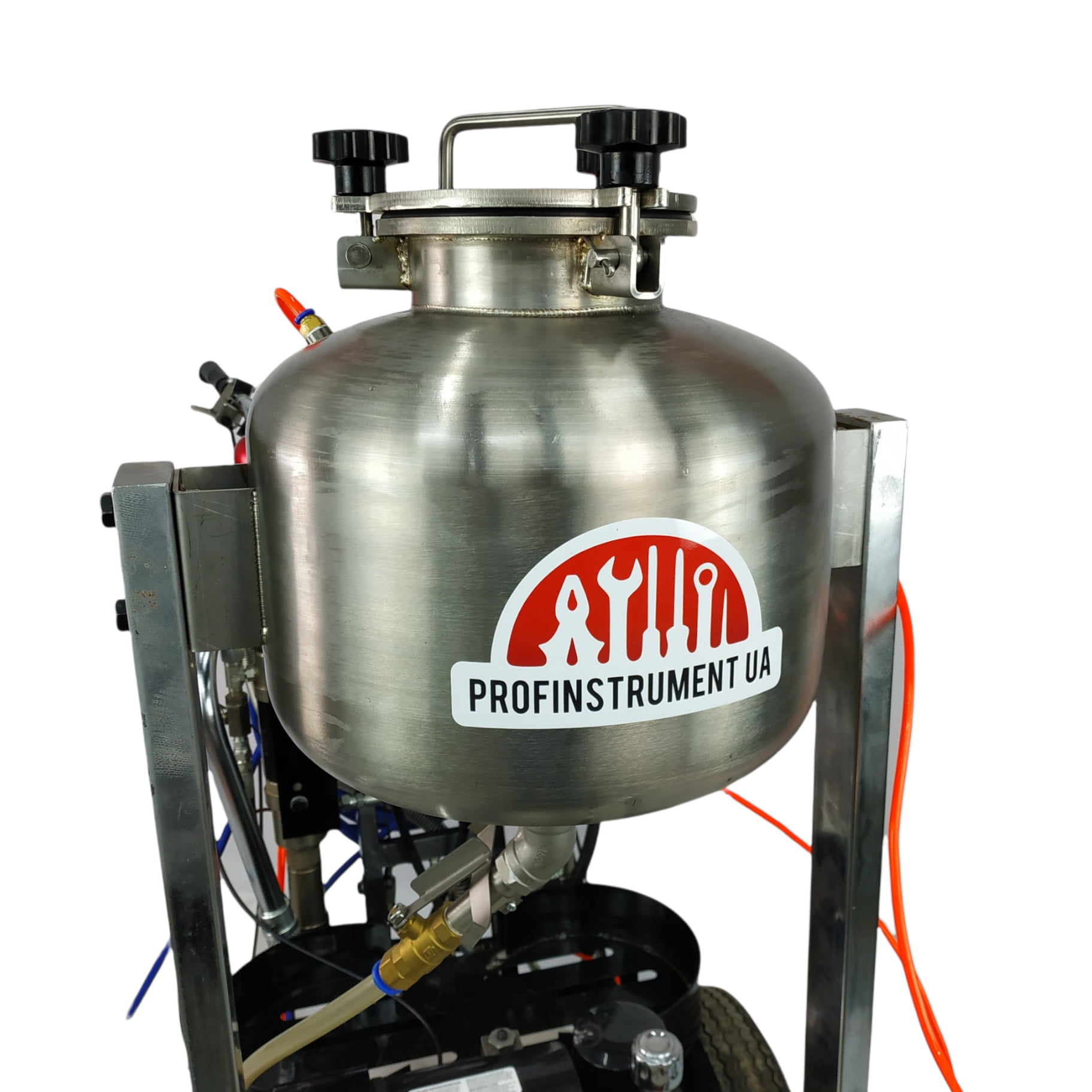 Данный аппарат оборудован двумя гидравлическими насосами, что позволяет работать с двухкомпонентными красками (холодным пластиком), пневматической установкой для нанесения стеклослоя и двумя пистолетами, что обеспечивает гораздо быстрее и производительнее выполнение запланированных работ.