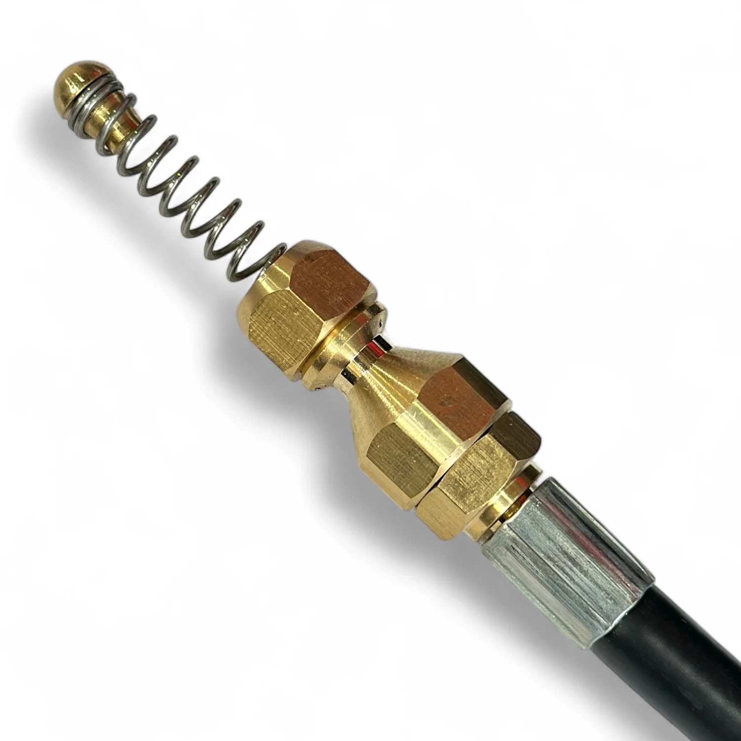 На резьбе форсуночной головки установлена металлическая пружина, обеспечивающая свободное прохождение стыков и поворотов под углом 90° в трубах диаметром 32-110 мм.